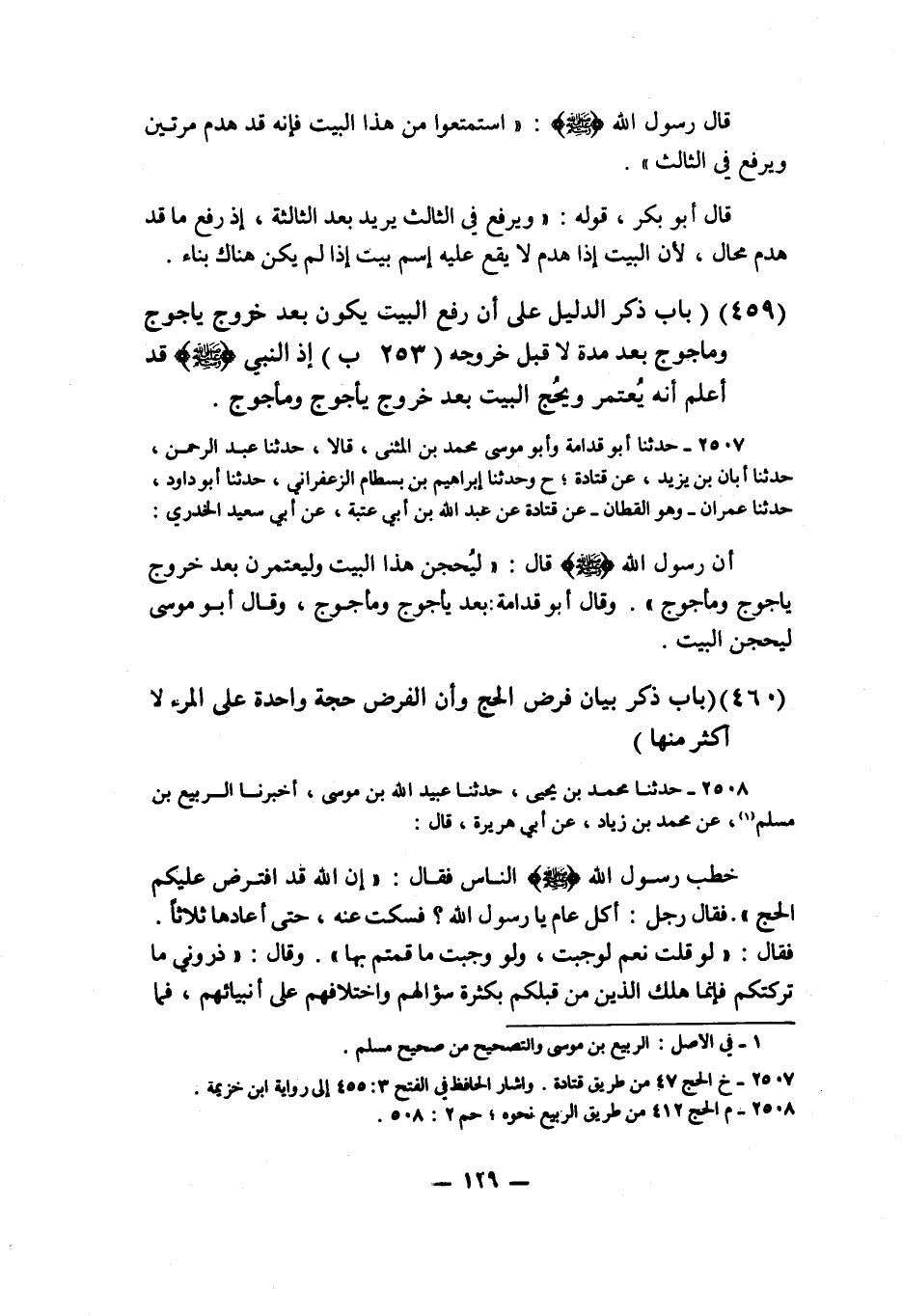2507 - حَدَّثَنَا أَبُو قُدَامَةَ، وَأَبُو مُوسَى مُحَمَّدُ بْنُ الْمُثَنَّى قَالَا: حَدَّثَنَا عَبْدُ الرَّحْمَنِ، حَدَّثَنَا أَبَانُ بْنُ يَزِيدَ، عَنْ قَتَادَةَ، ح وَحَدَّثَنَا إِبْرَاهِيمُ بْنُ بِسْطَامٍ الزَّعْفَرَانِيُّ، حَدَّثَنَا أَبُو دَاوُدَ، حَدَّثَنَا عِمْرَانُ وَهُوَ الْقَطَّانُ، عَنْ قَتَادَةَ، عَنْ عَبْدِ اللَّهِ بْنِ أَبِي عُتْبَةَ، عَنْ أَبِي سَعِيدٍ الْخُدْرِيِّ، أَنَّ رَسُولَ اللَّهِ صَلَّى اللهُ عَلَيْهِ وَسَلَّمَ قَالَ: «§لَيُحَجَّنَّ هَذَا الْبَيْتُ، وَلَيُعْتَمَرَنَّ بَعْدَ خُرُوجِ يَأْجُوجَ، وَمَأْجُوجَ» ، وَقَالَ أَبُو قُدَامَةَ: «بَعْدَ يَأْجُوجَ، وَمَأْجُوجَ» ، وَقَالَ أَبُو مُوسَى: «لَيُحَجَّنَّ الْبَيْتُ»