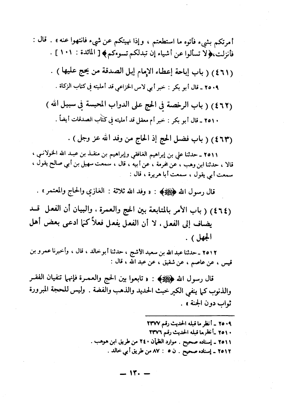 2512 - حَدَّثَنَا عَبْدُ اللَّهِ بْنُ سَعِيدٍ الْأَشَجُّ، حَدَّثَنَا أَبُو خَالِدٍ قَالَ: وَأَخْبَرَنَا عَمْرُو بْنُ قَيْسٍ، عَنْ عَاصِمٍ، عَنْ شَقِيقٍ، عَنْ عَبْدِ اللَّهِ قَالَ: قَالَ رَسُولُ اللَّهِ صَلَّى اللهُ عَلَيْهِ وَسَلَّمَ: «§تَابِعُوا بَيْنَ الْحَجِّ وَالْعُمْرَةِ، فَإِنَّهُمَا تَنْفِيَانِ الْفَقْرَ وَالذَّنُوبَ كَمَا يَنْفِي الْكِيرُ خَبَثَ الْحَدِيدِ، وَالذَّهَبِ وَالْفِضَّةِ، وَلَيْسَ لِلْحَجَّةِ الْمَبْرُورَةِ ثَوَابٌ دُونَ الْجَنَّةِ» K2512 - قال الأعظمي: إسناده صحيح