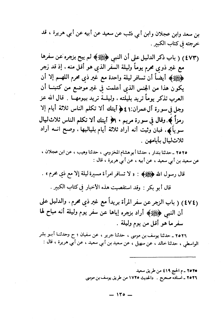 2525 - حَدَّثَنَا بُنْدَارٌ، حَدَّثَنَا أَبُو هِشَامٍ الْمَخْزُومِيُّ، حَدَّثَنَا وُهَيْبٌ، عَنِ ابْنِ عَجْلَانَ، عَنْ سَعِيدِ بْنِ أَبِي سَعِيدٍ، عَنْ أَبِيهِ، عَنْ أَبِي هُرَيْرَةَ قَالَ: قَالَ رَسُولُ اللَّهِ صَلَّى اللهُ عَلَيْهِ وَسَلَّمَ: «§لَا تُسَافِرِ امْرَأَةٌ مَسِيرَةَ لَيْلَةٍ إِلَّا مَعَ ذِي مَحْرَمٍ» قَالَ أَبُو بَكْرٍ: «وَقَدِ اسْتَقْصَيْتُ هَذِهِ الْأَخْبَارَ فِي كِتَابِ الْكَبِيرِ»