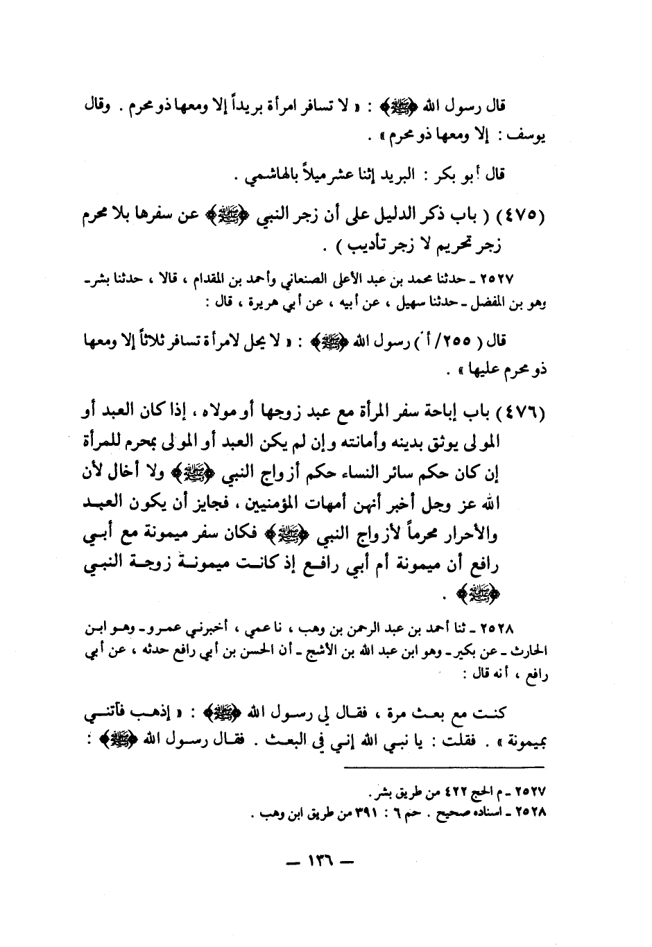 2527 - حَدَّثَنَا مُحَمَّدُ بْنُ عَبْدِ الْأَعْلَى الصَّنْعَانِيُّ، وَأَحْمَدُ بْنُ الْمِقْدَامِ قَالَا: حَدَّثَنَا بِشْرٌ وَهُوَ ابْنُ الْمُفَضَّلِ، حَدَّثَنَا سُهَيْلٌ، عَنْ أَبِيهِ، عَنْ أَبِي هُرَيْرَةَ قَالَ: قَالَ رَسُولُ اللَّهِ صَلَّى اللهُ عَلَيْهِ وَسَلَّمَ: «§لَا يَحِلُّ لِامْرَأَةٍ تُسَافِرُ ثَلَاثًا إِلَّا وَمَعَهَا ذُو مَحْرَمٍ عَلَيْهَا»