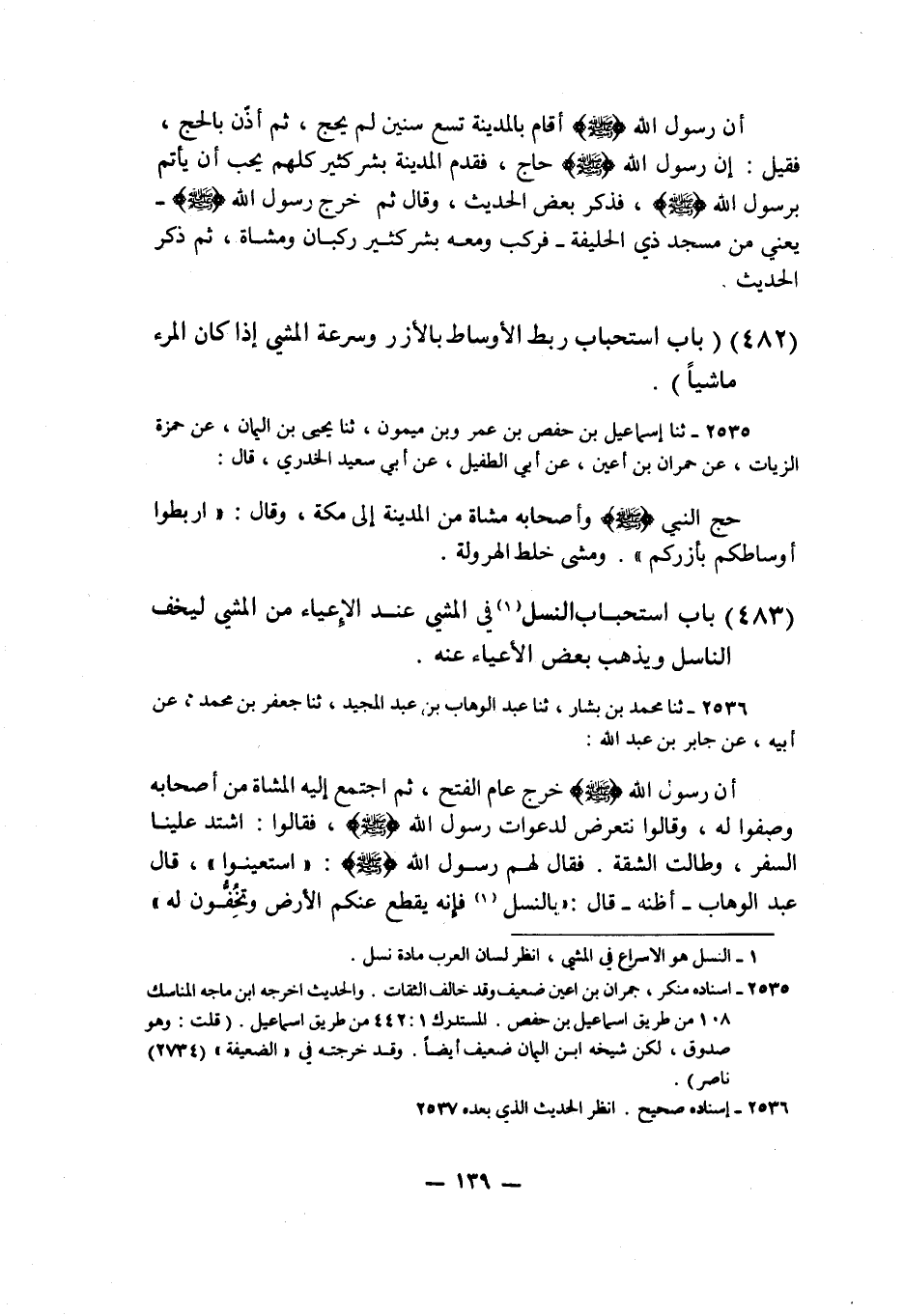 2535 - ثنا إِسْمَاعِيلُ بْنُ حَفْصِ بْنِ عُمَرَ بْنِ مَيْمُونٍ، ثنا يَحْيَى بْنُ الْيَمَانِ، عَنْ حَمْزَةَ الزَّيَّاتِ، عَنْ حُمْرَانَ بْنِ أَعْيَنَ، عَنْ أَبِي الطُّفَيْلِ، عَنْ أَبِي سَعِيدٍ الْخُدْرِيِّ قَالَ: §حَجَّ النَّبِيُّ صَلَّى اللهُ عَلَيْهِ وَسَلَّمَ وَأَصْحَابُهُ مُشَاةً مِنَ الْمَدِينَةِ إِلَى مَكَّةَ، وَقَالَ: «ارْبُطُوا أَوْسَاطَكُمْ بِأُزُرِكُمْ» ، وَمَشَى خِلْطَ الْهَرْوَلَةِK2535 - قال الأعظمي: إسناده منكر حمران بن أعين ضعيف وقد خالف الثقات