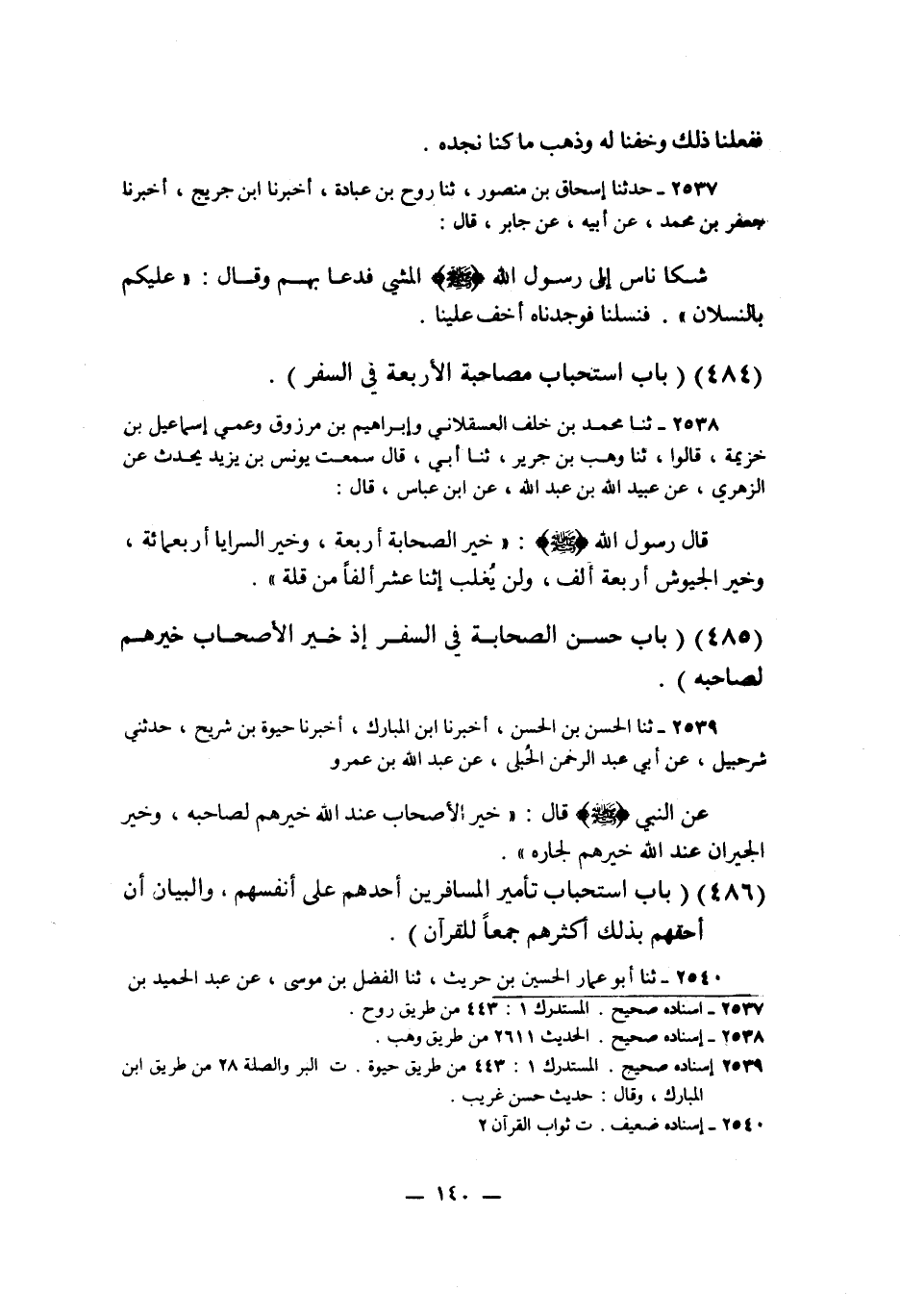 2537 - حَدَّثَنَا إِسْحَاقُ بْنُ مَنْصُورٍ، ثنا رَوْحُ بْنُ عُبَادَةَ، أَخْبَرَنَا ابْنُ جُرَيْجٍ، أَخْبَرَنَا جَعْفَرُ بْنُ مُحَمَّدٍ، عَنْ أَبِيهِ، عَنْ جَابِرٍ قَالَ: شَكَا نَاسٌ إِلَى رَسُولِ اللَّهِ صَلَّى اللهُ عَلَيْهِ وَسَلَّمَ الْمَشْيَ فَدَعَا بِهِمْ، وَقَالَ: «§عَلَيْكُمْ بِالنَّسْلَانُ» ، فَنَسَلْنَا فَوَجَدْنَاهُ أَخَفَّ عَلَيْنَاK2537 - قال الأعظمي: إسناده صحيح