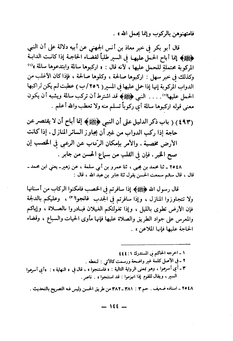 2548 - ثنا مُحَمَّدُ بْنُ يَحْيَى، ثنا عَمْرُو بْنُ أَبِي سَلَمَةَ، عَنْ زُهَيْرِ يَعْنِي ابْنَ مُحَمَّدٍ قَالَ: قَالَ سَالِمٌ: سَمِعْتُ الْحَسَنَ يَقُولُ: ثنا جَابِرُ بْنُ عَبْدِ اللَّهِ قَالَ: قَالَ رَسُولُ اللَّهِ صَلَّى اللهُ عَلَيْهِ وَسَلَّمَ: «§إِذَا سَافَرْتُمْ فِي الْخِصْبِ، فَأَمْكِنُوا الرِّكَابَ مِنْ أَسْنَانِهَا وَلَا تَتَجَاوَزُوا الْمَنَازِلَ، وَإِذَا سَافَرْتُمْ فِي الْجَدْبِ فَانْجُوا وَعَلَيْكُمْ بِالدُّلْجَةِ؛ فَإِنَّ الْأَرْضَ تُطْوَى بِاللَّيْلِ، وَإِذَا تَوَغَّلَتْكُمُ الْغِيلَانُ، فَبَادِرُوا بِالصَّلَاةِ، وَإِيَّاكُمْ وَالْمَعْرَسَ عَلَى جَوَادِ الطَّرِيقِ، وَالصَّلَاةَ عَلَيْهَا، فَإِنَّهَا مَأْوَى الْحَيَّاتِ وَالسِّبَاعِ وَقَضَاءِ الْحَاجَةِ عَلَيْهَا فَإِنَّهَا الْمَلَاعِنُ» K2548 - قال الأعظمي: إسناده ضعيف