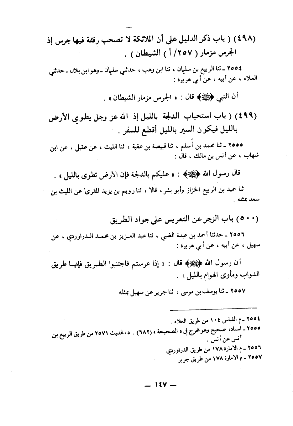 2557 - ثنا يُوسُفُ بْنُ مُوسَى، ثنا جَرِيرٌ، عَنْ سُهَيْلٍ بِمِثْلِهِ وَقَالَ: «§إِذَا عَرَّسْتُمْ بِاللَّيْلِ فَاجْتَنِبُوا الطَّرِيقَ؛ فَإِنَّهُ مَأْوَى الْهَوَامِّ بِاللَّيْلِ»