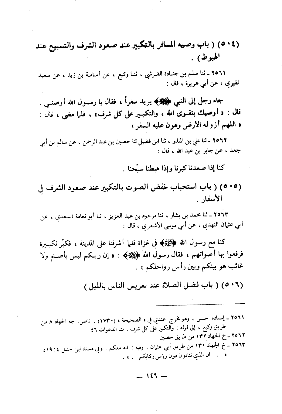 2562 - ثنا عَلِيُّ بْنُ الْمُنْذِرِ، ثنا ابْنُ فُضَيْلٍ، ثنا حَصِينُ بْنُ عَبْدِ الرَّحْمَنِ، عَنْ سَالِمِ بْنِ أَبِي الْجَعْدِ، عَنْ جَابِرِ بْنِ عَبْدِ اللَّهِ قَالَ: «كُنَّا §إِذَا صَعِدْنَا كَبَّرْنَا، وَإِذَا هَبَطْنَا سَبَّحْنَا»