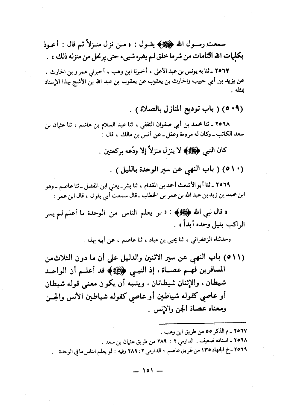 §بَابُ النَّهْيِ عَنْ سَيْرِ الِاثْنَيْنِ " وَالدَّلِيلِ عَلَى أَنَّ مَا دُونَ الثَّلَاثِ مِنَ الْمُسَافِرِينَ فَهُمْ عُصَاةٌ، إِذِ النَّبِيُّ صَلَّى اللهُ عَلَيْهِ وَسَلَّمَ قَدْ أَعْلَمَ أَنَّ الْوَاحِدَ شَيْطَانٌ، وَالِاثْنَانِ شَيْطَانَانِ، وَيُشْبِهُ أَنْ يَكُونَ مَعْنَى قَوْلِهِ: شَيْطَانٌ أَوْ عَاصِي، كَقَوْلِهِ شَيَاطِينَ أَوْ عَاصِي، كَقَوْلِهِ شَيَاطِينَ الْإِنْسِ وَالْجِنِّ، وَمَعْنَاهُ: عُصَاةُ الْجِنِّ وَالْإِنْسِ "