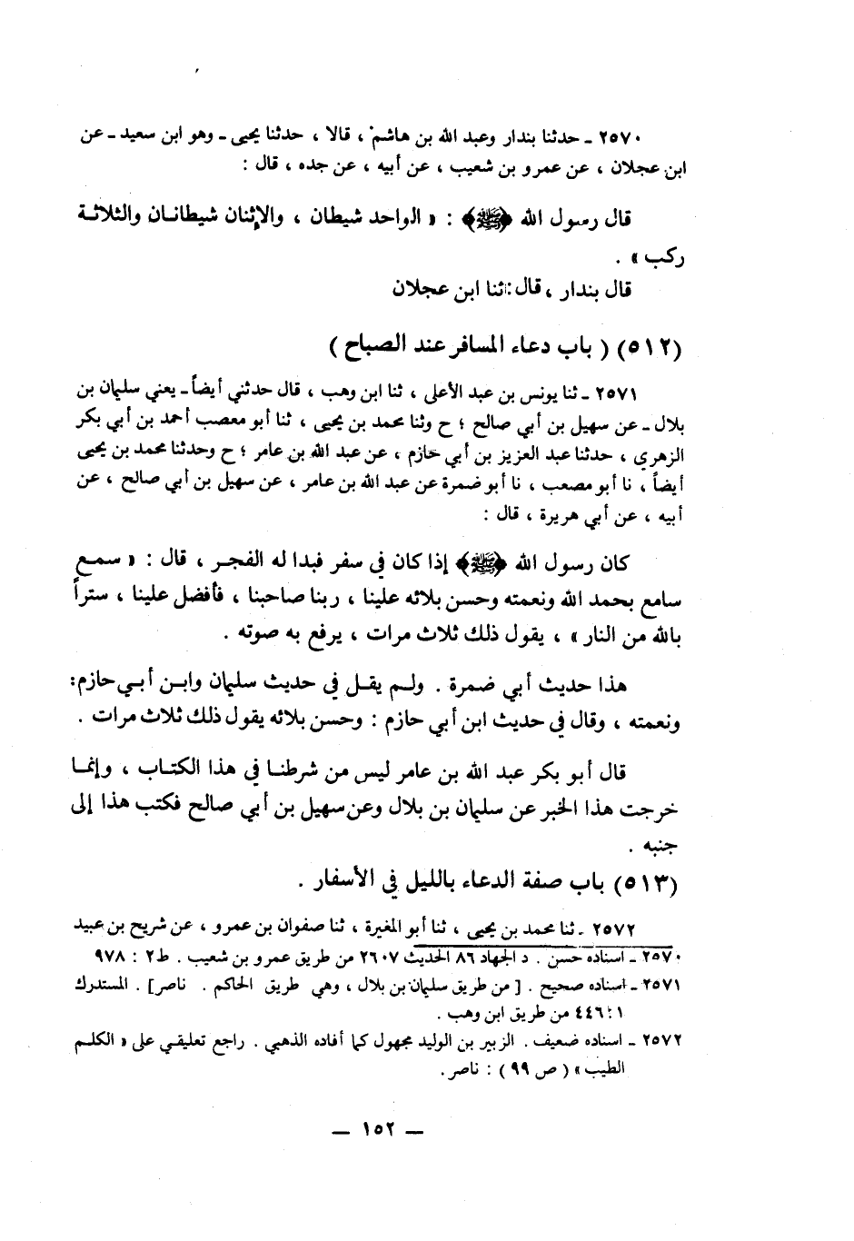 2570 - حَدَّثَنَا بُنْدَارٌ، وَعَبْدُ اللَّهِ بْنُ هَاشِمٍ قَالَا: حَدَّثَنَا يَحْيَى وَهُوَ ابْنُ سَعِيدٍ، عَنِ ابْنِ عَجْلَانَ، عَنْ عَمْرِو بْنِ شُعَيْبٍ، عَنْ أَبِيهِ، عَنْ جَدِّهِ قَالَ: قَالَ رَسُولُ اللَّهِ صَلَّى اللهُ عَلَيْهِ وَسَلَّمَ: «§الْوَاحِدُ شَيْطَانٌ وَالِاثْنَانِ شَيْطَانَانِ، وَالثَّلَاثَةُ رَكْبٌ» . قَالَ بُنْدَارٌ: قَالَ: ثنا ابْنُ عَجْلَانَK2570 - قال الأعظمي: إسناده حسن