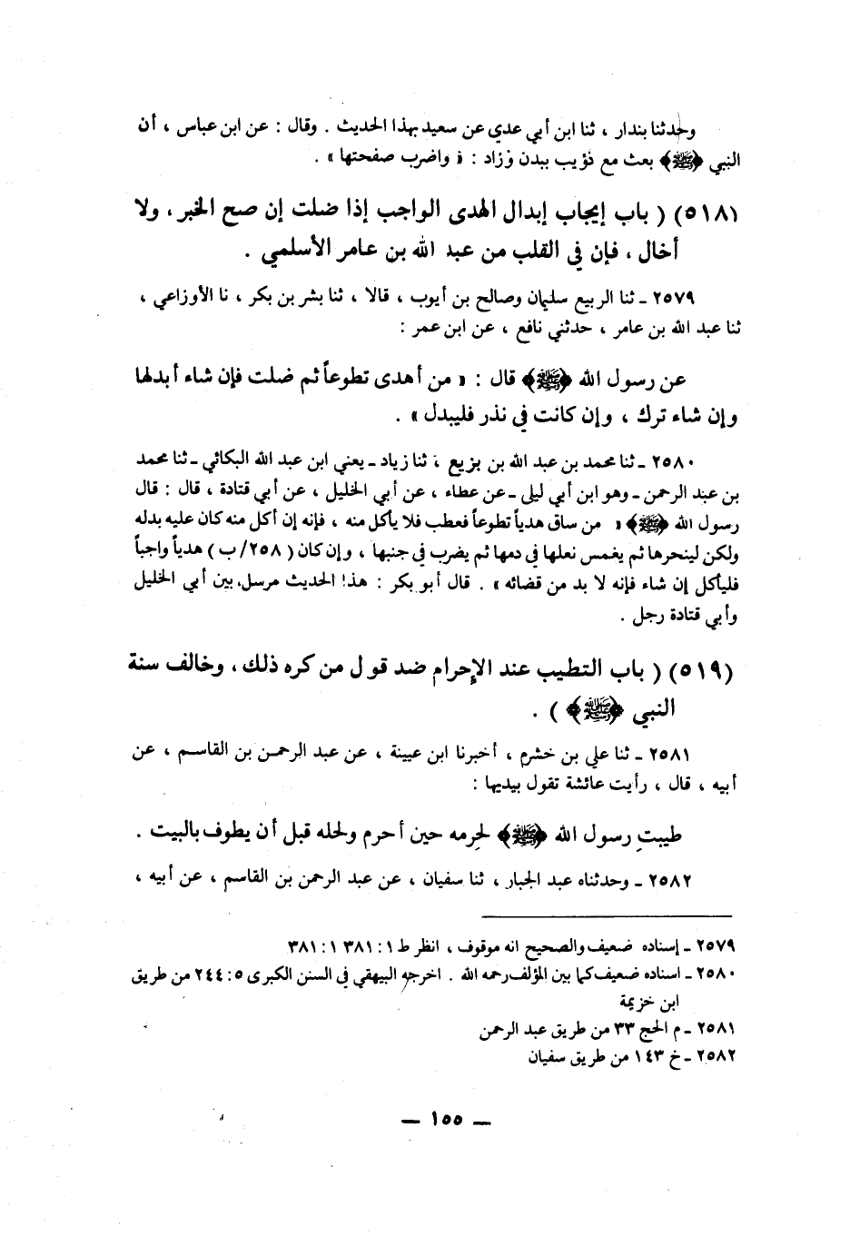 2581 - ثنا عَلِيُّ بْنُ خَشْرَمٍ، أَخْبَرَنَا ابْنُ عُيَيْنَةَ، عَنْ عَبْدِ الرَّحْمَنِ بْنِ الْقَاسِمِ، عَنْ أَبِيهِ قَالَ: رَأَيْتُ عَائِشَةَ تَقُولُ بِيَدَيْهَا: «§طَيَّبْتُ رَسُولَ اللَّهِ صَلَّى اللهُ عَلَيْهِ وَسَلَّمَ لِحُرْمِهِ حِينَ أَحْرَمَ وَلِحِلِّهِ قَبْلَ أَنْ يَطُوفَ بِالْبَيْتِ»