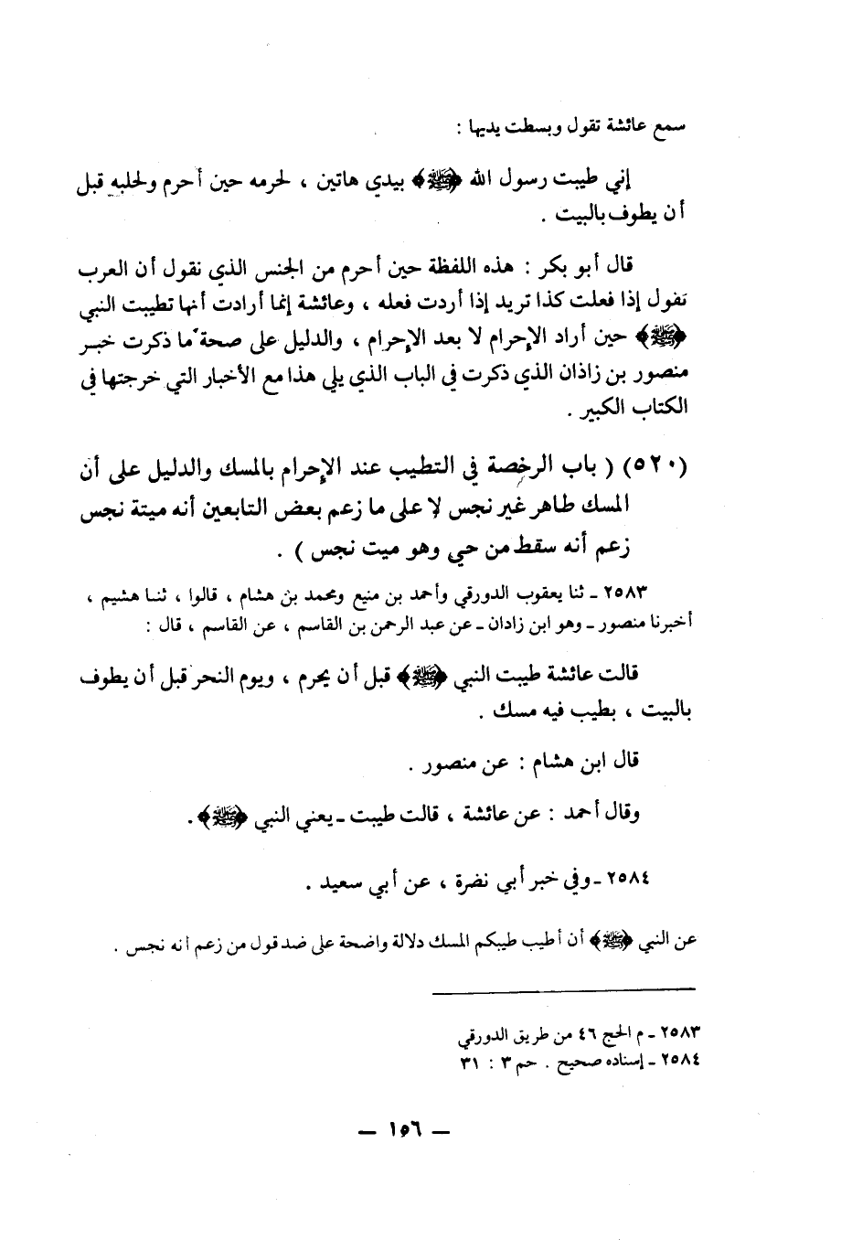 2583 - ثنا يَعْقُوبُ الدَّوْرَقِيُّ، وَأَحْمَدُ بْنُ مَنِيعٍ، وَمُحَمَّدُ بْنُ هِشَامٍ قَالُوا: ثنا هُشَيْمٌ، أَخْبَرَنَا مَنْصُورٌ وَهُوَ ابْنُ زَاذَانَ، عَنْ عَبْدِ الرَّحْمَنِ بْنِ الْقَاسِمِ، عَنِ الْقَاسِمِ قَالَ: قَالَتْ عَائِشَةُ: «§طَيَّبْتُ النَّبِيَّ صَلَّى اللهُ عَلَيْهِ وَسَلَّمَ قَبْلَ أَنْ يُحْرِمَ وَيَوْمَ النَّحْرِ، قَبْلَ أَنْ يَطُوفَ بِالْبَيْتِ بِطِيبٍ فِيهِ مَسْكٌ» قَالَ ابْنُ هِشَامٍ، عَنْ مَنْصُورٍ، وَقَالَ أَحْمَدُ، عَنْ عَائِشَةَ قَالَتْ: «طَيَّبْتُ يَعْنِي النَّبِيَّ صَلَّى اللهُ عَلَيْهِ وَسَلَّمَ»