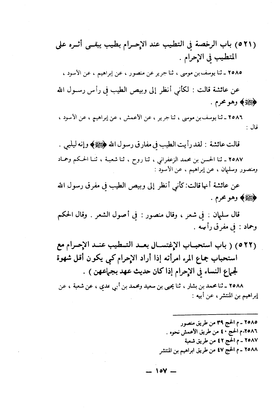 2585 - ثنا يُوسُفُ بْنُ مُوسَى، ثنا جَرِيرٌ، عَنْ مَنْصُورٍ، عَنْ إِبْرَاهِيمَ، عَنِ الْأَسْوَدِ، عَنْ عَائِشَةَ قَالَتْ: «§لَكَأَنِّي أَنْظُرُ إِلَى وَبِيصِ الطِّيبِ فِي رَأْسِ رَسُولِ اللَّهِ صَلَّى اللهُ عَلَيْهِ وَسَلَّمَ وَهُوَ مُحْرِمٌ»