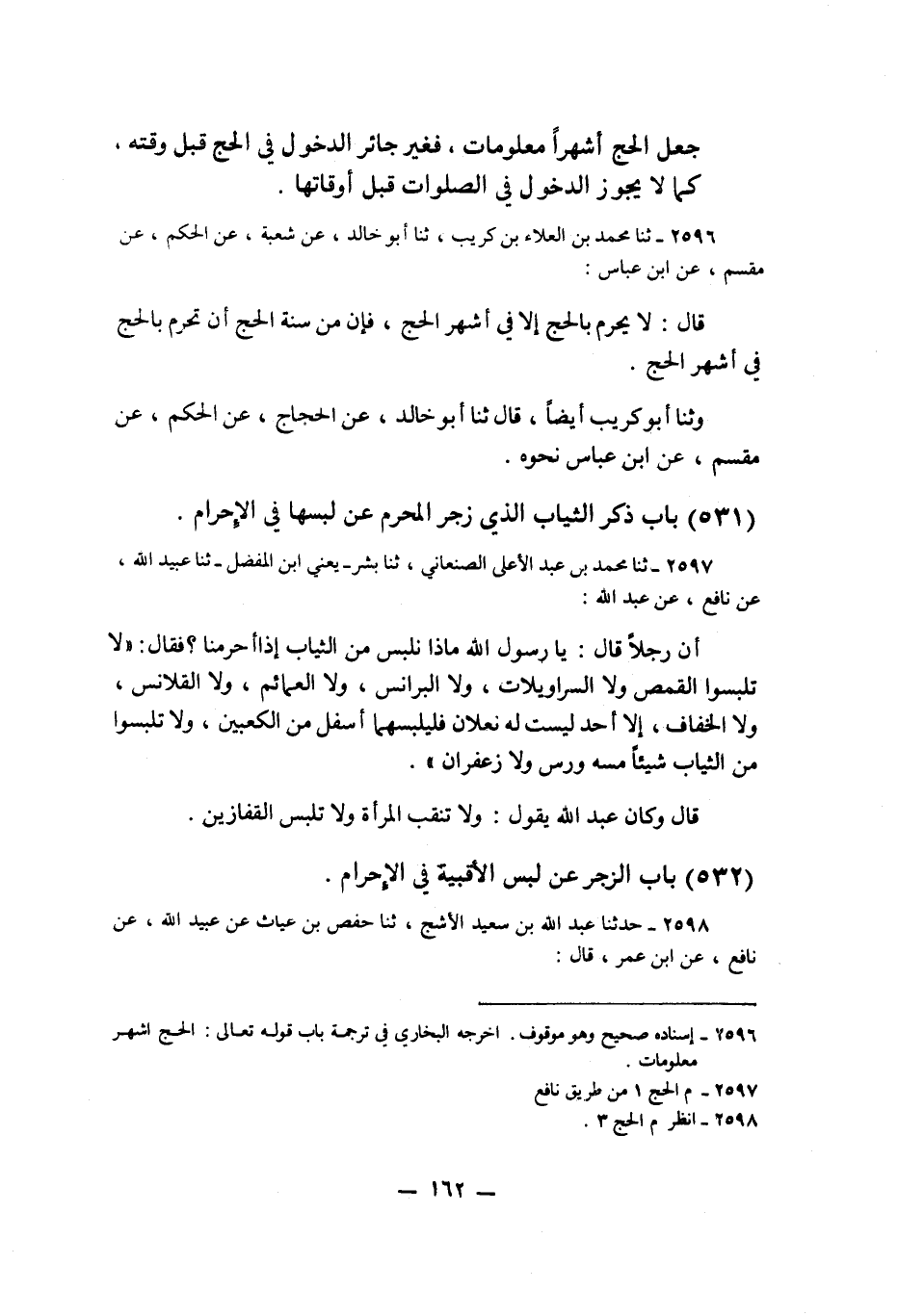 2598 - حَدَّثَنَا عَبْدُ اللَّهِ بْنُ سَعِيدٍ الْأَشَجُّ، ثنا حَفْصُ بْنُ غِيَاثٍ، عَنْ عُبَيْدِ اللَّهِ، عَنْ نَافِعٍ، عَنِ ابْنِ عُمَرَ قَالَ: «§نَهَى رَسُولُ اللَّهِ صَلَّى اللهُ عَلَيْهِ وَسَلَّمَ أَنْ يَلْبَسَ الْمُحْرِمَ الْقُمُصَ أَوِ الْأَقْبِيَةَ أَوِ الْخُفَّيْنِ إِلَّا أَنْ لَا يَجِدَ نَعْلَيْنِ أَوِ السَّرَاوِيلَاتِ أَوْ يَلْبَسَ شَيْئًا مَسَّهُ وَرْسٌ أَوْ زَعْفَرَانٌ»