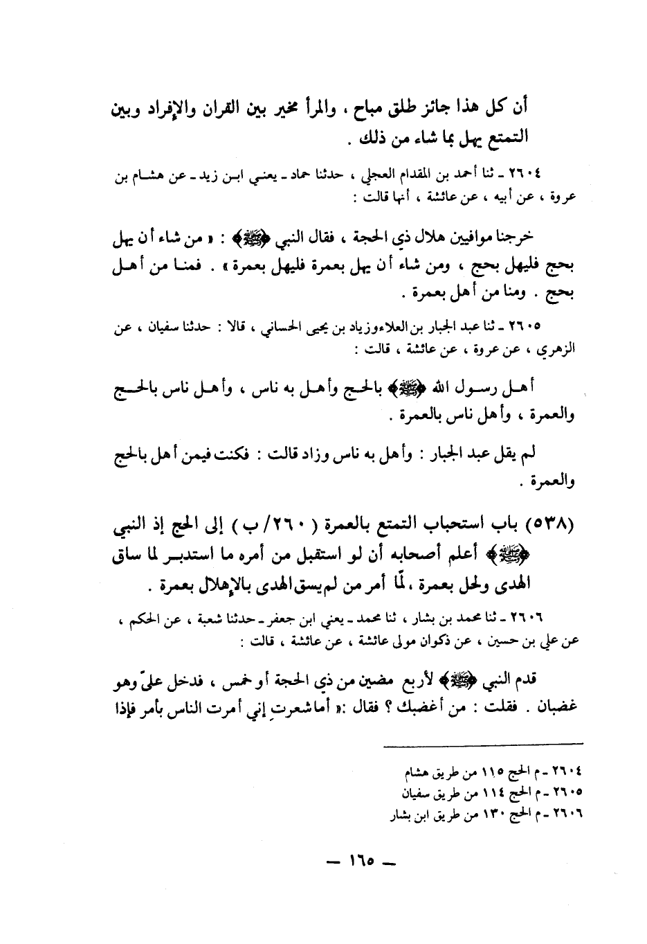 2605 - ثنا عَبْدُ الْجَبَّارِ بْنُ الْعَلَاءِ، وَزِيَادُ بْنُ يَحْيَى الْحَسَّانِيُّ قَالَا: حَدَّثَنَا سُفْيَانُ، عَنِ الزُّهْرِيِّ، عَنْ عُرْوَةَ، عَنْ عَائِشَةَ قَالَتْ: «§أَهَلَّ رَسُولُ اللَّهِ صَلَّى اللهُ عَلَيْهِ وَسَلَّمَ بِالْحَجِّ وَأَهَلَّ بِهِ نَاسٌ، وَأَهَلَّ نَاسٌ بِالْحَجِّ وَالْعُمْرَةِ، وَأَهَلَّ نَاسٌ بِالْعُمْرَةِ» . لَمْ يَقُلْ عَبْدُ الْجَبَّارِ: وَأَهَلَّ بِهِ نَاسٌ، وَزَادَ قَالَتْ: فَكُنْتُ فِيمَنْ أَهَلَّ بِالْحَجِّ وَالْعُمْرَةِ