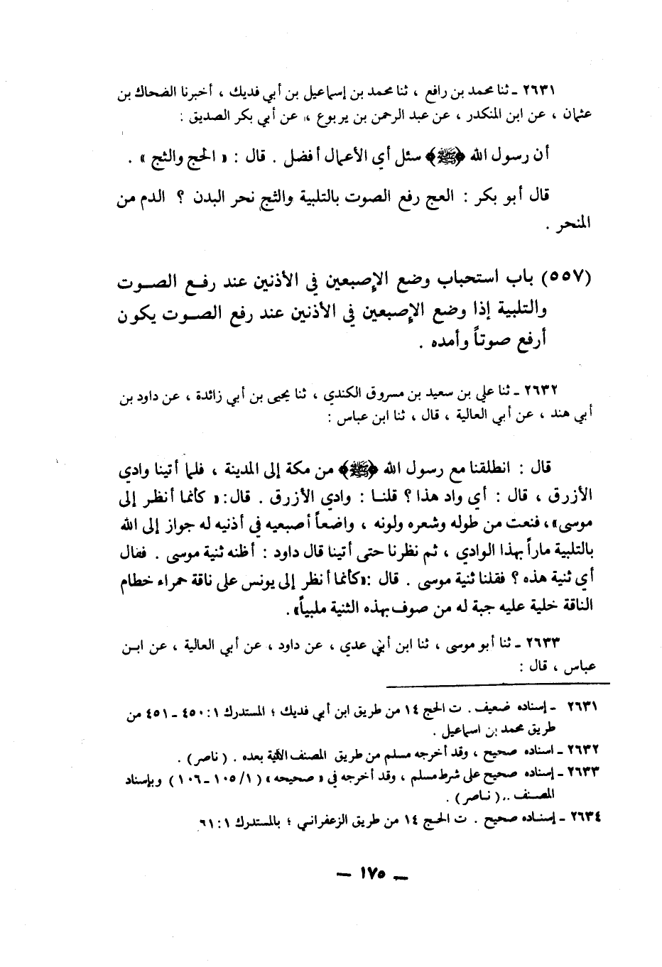 2632 - ثنا عَلِيُّ بْنُ سَعِيدِ بْنِ مَسْرُوقٍ الْكِنْدِيُّ، ثنا يَحْيَى بْنُ أَبِي زَائِدَةَ، عَنْ دَاوُدَ بْنِ أَبِي هِنْدَ، عَنْ أَبِي الْعَالِيَةِ قَالَ: ثنا ابْنُ عَبَّاسٍ قَالَ: انْطَلَقْنَا مَعَ رَسُولِ اللَّهِ صَلَّى اللهُ عَلَيْهِ وَسَلَّمَ مِنْ مَكَّةَ إِلَى الْمَدِينَةِ فَلَمَّا أَتَيْنَا وَادِيَ الْأَزْرَقِ قَالَ: «§أَيُّ وَادٍ هَذَا؟» قُلْنَا: وَادِي الْأَزْرَقِ قَالَ: «كَأَنَّمَا أَنْظُرُ إِلَى مُوسَى» ، فَنَعَتَ مِنْ طُولِهِ، وَشَعْرِهِ، وَلَوْنِهِ وَاضِعًا أُصْبُعَيْهِ فِي أُذُنَيْهِ لَهُ جَوَازٌ إِلَى اللَّهِ بِالتَّلْبِيَةِ مَارًّا بِهَذَا الْوَادِي، ثُمَّ نَظَرْنَا حَتَّى أَتَيْنَا قَالَ دَاوُدُ: أَظُنُّهُ ثَنِيَّةَ مُوسَى، فَقَالَ: «أَيُّ ثَنِيَّةٍ هَذِهِ؟» فَقُلْنَا: ثَنِيَّةُ مُوسَى قَالَ: «كَأَنَّمَا أَنْظُرُ إِلَى يُونُسَ عَلَى نَاقَةٍ حَمْرَاءَ، خِطَامُ النَّاقَةِ خَلِيَّةٌ، عَلَيْهِ جُبَّةٌ لَهُ مِنْ صُوفٍ بِهَذِهِ الثَّنِيَّةِ مُلَبِّيًا» K2632 - قال الألباني: إسناده صحيح