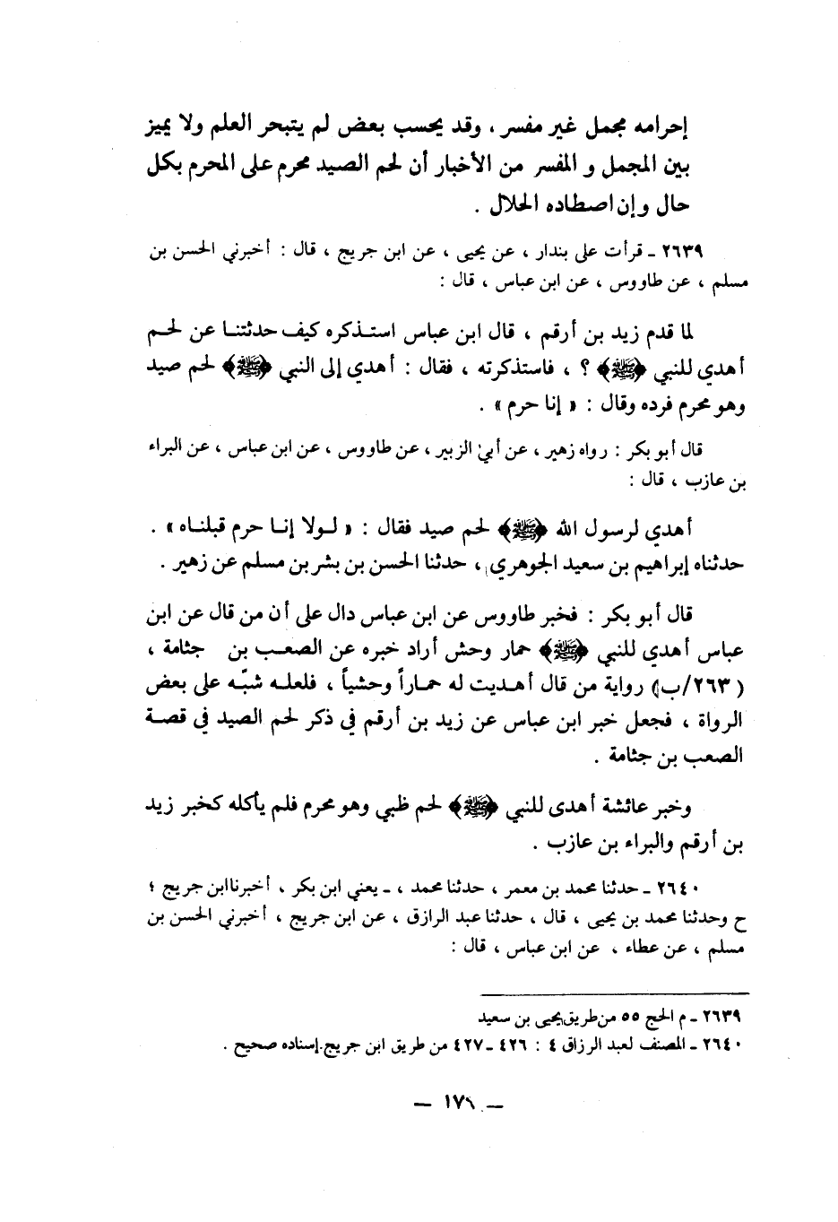2640 - حَدَّثَنَا مُحَمَّدُ بْنُ مَعْمَرٍ، حَدَّثَنَا مُحَمَّدُ يَعْنِي ابْنَ بَكْرٍ، أَخْبَرَنَا ابْنُ جُرَيْجٍ، ح وَحَدَّثَنَا مُحَمَّدُ بْنُ يَحْيَى قَالَ: حَدَّثَنَا عَبْدُ الرَّزَّاقِ، عَنِ ابْنِ جُرَيْجٍ، أَخْبَرَنِي الْحَسَنُ بْنُ مُسْلِمٍ، عَنْ طَاوُسٍ، عَنِ ابْنِ عَبَّاسٍ قَالَ: قَدِمَ زَيْدُ بْنُ أَرْقَمَ مَكَّةَ - لَمْ يَقُلِ ابْنُ مَعْمَرٍ مَكَّةَ - فَقَالَ ابْنُ عَبَّاسٍ يَسْتَذْكِرُ: كَيْفَ أَخْبَرْتَنِي عَنْ لَحْمٍ أُهْدِيَ لِلنَّبِيِّ صَلَّى اللهُ عَلَيْهِ وَسَلَّمَ حَرَامًا؟ قَالَ: نَعَمْ أَهْدَى لَهُ رَجُلٌ عُضْوًا مِنْ لَحْمِ صَيْدٍ، فَرَدَّهُ عَلَيْهِ، وَقَالَ: «§إِنَّا لَا نَأْكُلُهُ إِنَّا حُرُمٌ» K2640 - قال الأعظمي: إسناده صحيح