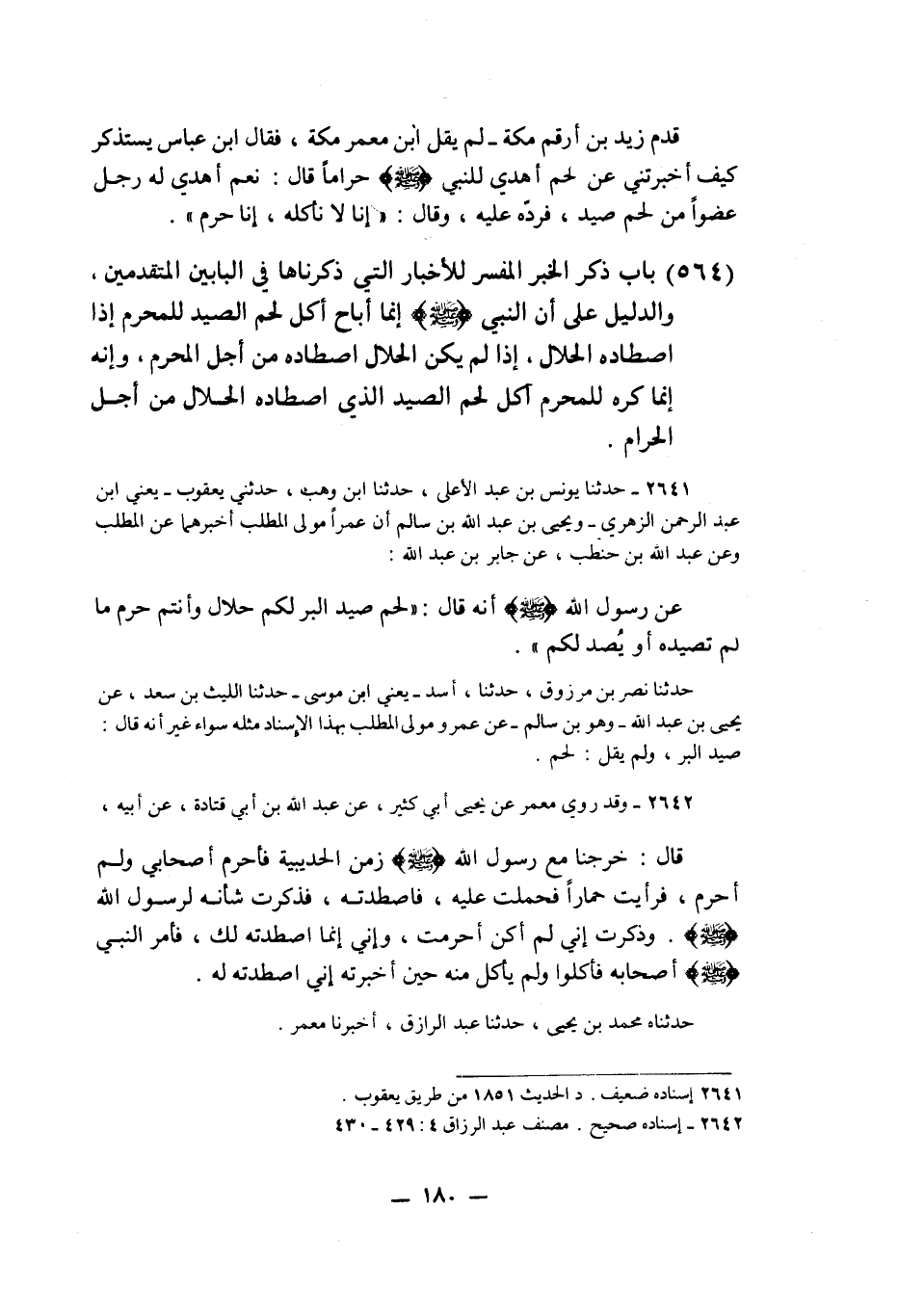 2642 - وَقَدْ رَوَى مَعْمَرٌ، عَنْ يَحْيَى أَبِي كَثِيرٍ، عَنْ عَبْدِ اللَّهِ بْنِ أَبِي قَتَادَةَ، عَنْ أَبِيهِ قَالَ: «خَرَجْنَا مَعَ رَسُولِ اللَّهِ صَلَّى اللهُ عَلَيْهِ وَسَلَّمَ زَمَنَ الْحُدَيْبِيَةِ فَأَحْرَمَ أَصْحَابِي، وَلَمْ أُحْرِمْ فَرَأَيْتُ حِمَارًا فَحَمَلْتُ عَلَيْهِ فَاصْطَدْتُهُ فَذَكَرْتُ شَأْنَهُ لِرَسُولِ اللَّهِ صَلَّى اللهُ عَلَيْهِ وَسَلَّمَ، وَذَكَرْتُ أَنِّي §لَمْ أَكُنْ أَحْرَمْتُ، وَأَنِّي إِنَّمَا اصْطَدْتُهُ لَكَ، فَأَمَرَ النَّبِيُّ صَلَّى اللهُ عَلَيْهِ وَسَلَّمَ أَصْحَابَهُ، فَأَكَلُوا، وَلَمْ يَأْكُلْ مِنْهُ حِينَ أَخْبَرْتُهُ أَنِّي اصْطَدْتُهُ لَهُ» . حَدَّثَنَاهُ مُحَمَّدُ بْنُ يَحْيَى، حَدَّثَنَا عَبْدُ الرَّزَّاقِ، أَخْبَرَنَا مَعْمَرٌ. قَالَ أَبُو بَكْرٍ: " هَذِهِ الزِّيَادَةُ: إِنَّمَا اصْطَدْتُهُ لَكَ، وَقَوْلُهُ: وَلَمْ يَأْكُلْ مِنْهُ حِينَ أَخْبَرْتُهُ أَنِّي اصْطَدْتُهُ لَكَ، لَا أَعْلَمُ أَحَدًا ذَكَرَهُ فِي خَبَرِ أَبِي قَتَادَةَ غَيْرَ مَعْمَرٍ فِي هَذَا الْإِسْنَادِ، فَإِنْ صَحَّتْ هَذِهِ اللَّفْظَةُ فيُشْبِهُ أَنْ يَكُونَ صَلَّى اللهُ عَلَيْهِ وَسَلَّمَ أَكَلَ مِنْ لَحْمِ ذَلِكَ الْحِمَارِ، قَبْلَ أَنْ يُعْلِمَهُ أَبُو قَتَادَةَ أَنَّهُ اصْطَادَهُ مِنْ أَجْلِهِ، فَلَمَّا أَعْلَمَهُ أَبُو قَتَادَةَ أَنَّهُ اصْطَادَهُ مِنْ أَجْلِهِ امْتَنَعَ مِنْ أَكْلِهِ بَعْدَ إِعْلَامِهِ إِيَّاهُ أَنَّهُ اصْطَادَهُ مِنْ أَجْلِهِ؛ لِأَنَّهُ قَدْ ثَبَتَ عَنْهُ صَلَّى اللهُ عَلَيْهِ وَسَلَّمَ أَنَّهُ قَدْ أَكَلَ مِنْ لَحْمِ ذَلِكَ الْحِمَارِ "K2642 - قال الأعظمي: إسناده صحيح