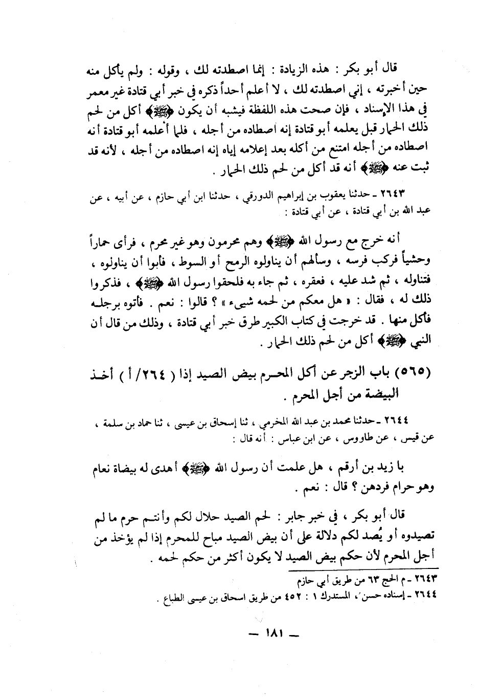 2644 - حَدَّثَنَا مُحَمَّدُ بْنُ عَبْدِ اللَّهِ الْمُخَرِّمِيُّ، ثنا إِسْحَاقُ بْنُ عِيسَى، ثنا حَمَّادُ بْنُ سَلَمَةَ، عَنْ قَيْسٍ، عَنْ طَاوُسٍ، عَنِ ابْنِ عَبَّاسٍ، أَنَّهُ قَالَ: يَا زَيْدَ بْنَ أَرْقَمَ §هَلْ عَلِمْتَ أَنَّ رَسُولَ اللَّهِ صَلَّى اللهُ عَلَيْهِ وَسَلَّمَ أُهْدِيَ لَهُ بَيْضَاتُ نَعَامٍ وَهُوَ حَرَامٌ فَرَدَّهُنَّ؟ قَالَ: «نَعَمْ» . قَالَ أَبُو بَكْرٍ: " فِي خَبَرِ جَابِرٍ: لَحْمُ الصَّيْدِ حَلَالٌ لَكُمْ وَأَنْتُمْ حُرُمٌ مَا لَمْ تَصِيدُوهُ أَوْ يُصَدْ لَكُمْ، دَلَالَةٌ عَلَى أَنَّ بَيْضَ الصَّيْدِ مُبَاحٌ لِلْمُحْرِمِ إِذَا لَمْ يُؤْخَذْ مِنْ أَجْلِ الْمُحْرِمِ؛ لِأَنَّ حُكْمَ بَيْضِ الصَّيْدِ لَا يَكُونُ أَكْثَرَ مِنْ حُكْمِ لَحْمِهِ "K2644 - قال الأعظمي: إسناده حسن