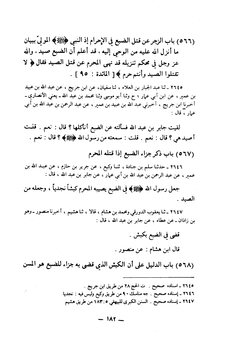 2646 - حَدَّثَنَا سَلْمُ بْنُ جُنَادَةَ، ثنا وَكِيعٌ، عَنْ جَرِيرِ بْنِ حَازِمٍ، عَنْ عَبْدِ اللَّهِ بْنِ عُمَيْرٍ، عَنْ عَبْدِ الرَّحْمَنِ بْنِ عَبْدِ اللَّهِ بْنِ أَبِي عَمَّارٍ، عَنْ جَابِرِ بْنِ عَبْدِ اللَّهِ قَالَ: §جَعَلَ رَسُولُ اللَّهِ صَلَّى اللهُ عَلَيْهِ وَسَلَّمَ فِي الضَّبُعِ يُصِيبُهُ الْمُحْرِمُ كَبْشًا نَجْدِيًّا، وَجَعَلَهُ مِنَ الصَّيْدِK2646 - قال الأعظمي: إسناده صحيح