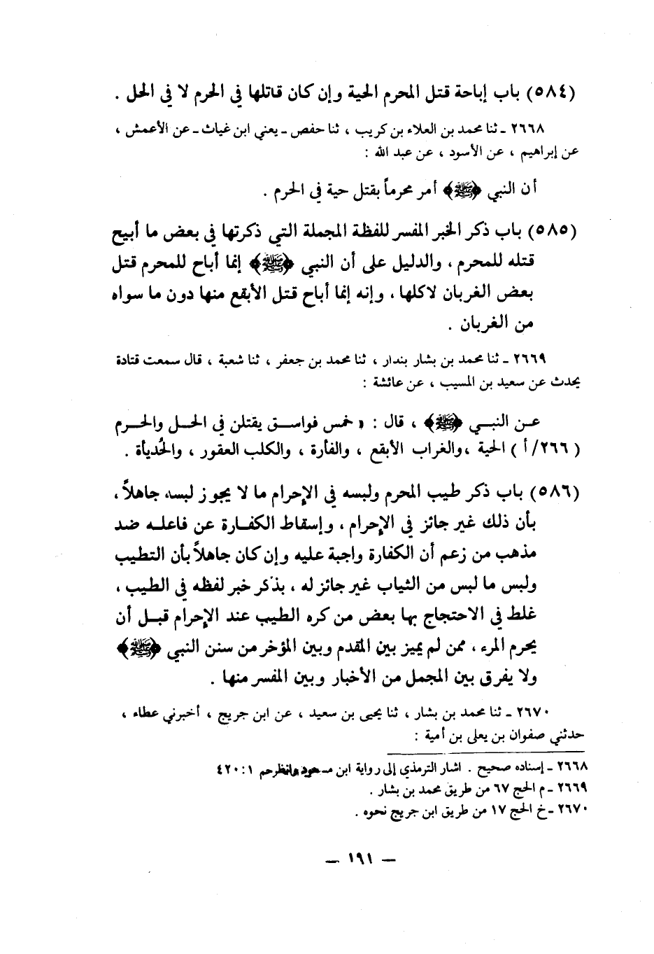2668 - ثنا مُحَمَّدُ بْنُ الْعَلَاءِ بْنِ كُرَيْبٍ، ثنا حَفْصٌ يَعْنِي ابْنَ غِيَاثٍ، عَنِ الْأَعْمَشِ، عَنْ إِبْرَاهِيمَ، عَنِ الْأَسْوَدِ، عَنْ عَبْدِ اللَّهِ، أَنَّ النَّبِيَّ صَلَّى اللهُ عَلَيْهِ وَسَلَّمَ «§أَمَرَ مُحْرِمًا بِقَتْلِ حَيَّةٍ فِي الْحَرَمِ» K2668 - قال الأعظمي: إسناده صحيح