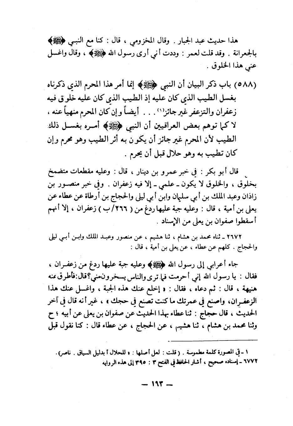 2672 - ثَنَاهُ مُحَمَّدُ بْنُ هِشَامٍ ثنا هُشَيْمٌ، عَنْ مَنْصُورٍ، وَعَبْدُ الْمَلَكِ، وَابْنُ أَبِي لَيْلَى، وَالْحَجَّاجُ، كُلُّهُمْ عَنْ عَطَاءٍ، عَنْ يَعْلَى بْنِ أُمَيَّةَ قَالَ: جَاءَ أَعْرَابِيٌّ إِلَى رَسُولِ اللَّهِ صَلَّى اللهُ عَلَيْهِ وَسَلَّمَ، وَعَلَيْهِ جُبَّةٌ عَلَيْهَا رَدْغٌ مِنْ زَعْفَرَانٍ، فَقَالَ: يَا رَسُولَ اللَّهِ إِنِّي أَحْرَمْتُ فَمَا تَرَى، وَالنَّاسُ يَسْخَرُونَ مِنِّي قَالَ: فَأَطْرَقَ عَنْهُ هُنَيْهَةً قَالَ: ثُمَّ دَعَاهُ فَقَالَ: " §اخْلَعْ عَنْكَ هَذِهِ الْجُبَّةَ، وَاغْسِلْ عَنْكَ هَذَا الزَّعْفَرَانَ، وَاصْنَعْ فِي عُمْرَتِكَ مَا كُنْتَ تَصْنَعُ فِي حَجَّتِكَ غَيْرَ أَنَّهُ قَالَ فِي آخِرِ الْحَدِيثِ قَالَ حَجَّاجٌ ثنا عَطَاءٌ بِهَذَا الْحَدِيثِ عَنْ صَفْوَانَ بْنِ يَعْلَى عَنْ أَبِيهِ ح وَثنا مُحَمَّدُ بْنُ هِشَامٍ ثنا هُشَيْمٌ عَنِ الْحَجَّاجِ عَنْ عَطَاءٍ قَالَ: كُنَّا نَقُولُ قَبْلَ أَنْ يَبْلُغَنَا هَذَا الْحَدِيثُ يَخْرِقُ جُبَّتَهُ، فَلَمَّا بَلَغَنَا هَذَا الْحَدِيثُ أَخَذْنَا بِهِK2672 - قال الأعظمي: إسناده صحيح