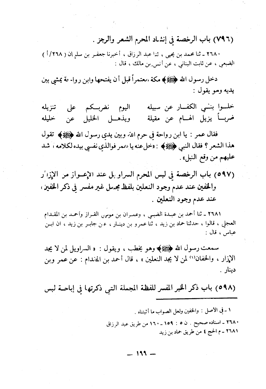 2681 - ثنا أَحْمَدُ بْنُ عَبْدَةَ الضَّبِّيُّ، وَعِمْرَانُ بْنُ مُوسَى الْقَزَّازُ، وَأَحْمَدُ بْنُ الْمِقْدَامِ الْعِجْلِيُّ قَالُوا: حَدَّثَنَا حَمَّادُ بْنُ زَيْدٍ، ثنا عَمْرُو بْنُ دِينَارٍ، عَنْ جَابِرِ بْنِ زَيْدٍ، أَنَّ ابْنَ عَبَّاسٍ قَالَ: سَمِعْتُ رَسُولَ اللَّهِ صَلَّى اللهُ عَلَيْهِ وَسَلَّمَ، وَهُوَ يَخْطُبُ، وَيَقُولُ: «§السَّرَاوِيلُ لِمَنْ لَا يَجِدُ الْإِزَارَ وَالْخُفَّانِ لِمَنْ لَا يَجِدُ النَّعْلَيْنِ» قَالَ أَحْمَدُ بْنُ الْمِقْدَامِ عَنْ عَمْرِو بْنِ دِينَارٍ