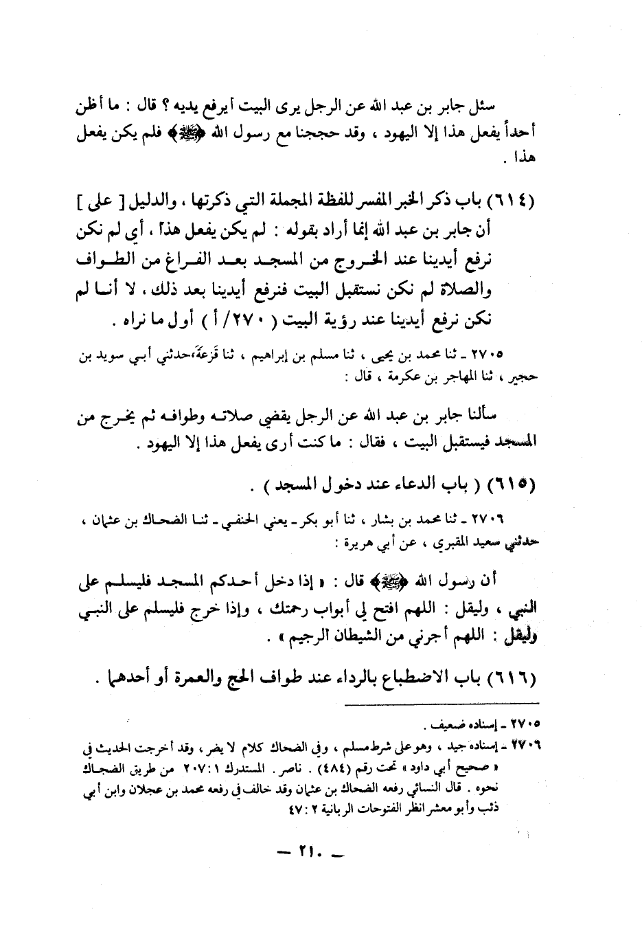 2705 - ثنا مُحَمَّدُ بْنُ يَحْيَى، ثنا مُسْلِمُ بْنُ إِبْرَاهِيمَ، ثنا قَزْعَةُ، حَدَّثَنِي سُوَيْدُ بْنُ حُجَيْرٍ، ثنا الْمُهَاجِرُ بْنُ عِكْرِمَةَ قَالَ: سَأَلْنَا جَابِرَ بْنَ عَبْدِ اللَّهِ عَنِ الرَّجُلِ §يَقْضِي صَلَاتَهُ وَطَوَافَهُ ثُمَّ يَخْرُجُ مِنَ الْمَسْجِدِ فَيَسْتَقْبِلُ الْبَيْتَ، فَقَالَ: مَا كُنْتُ أَرَى يَفْعَلُ هَذَا إِلَّا الْيَهُودَK2705 - قال الأعظمي: إسناده ضعيف