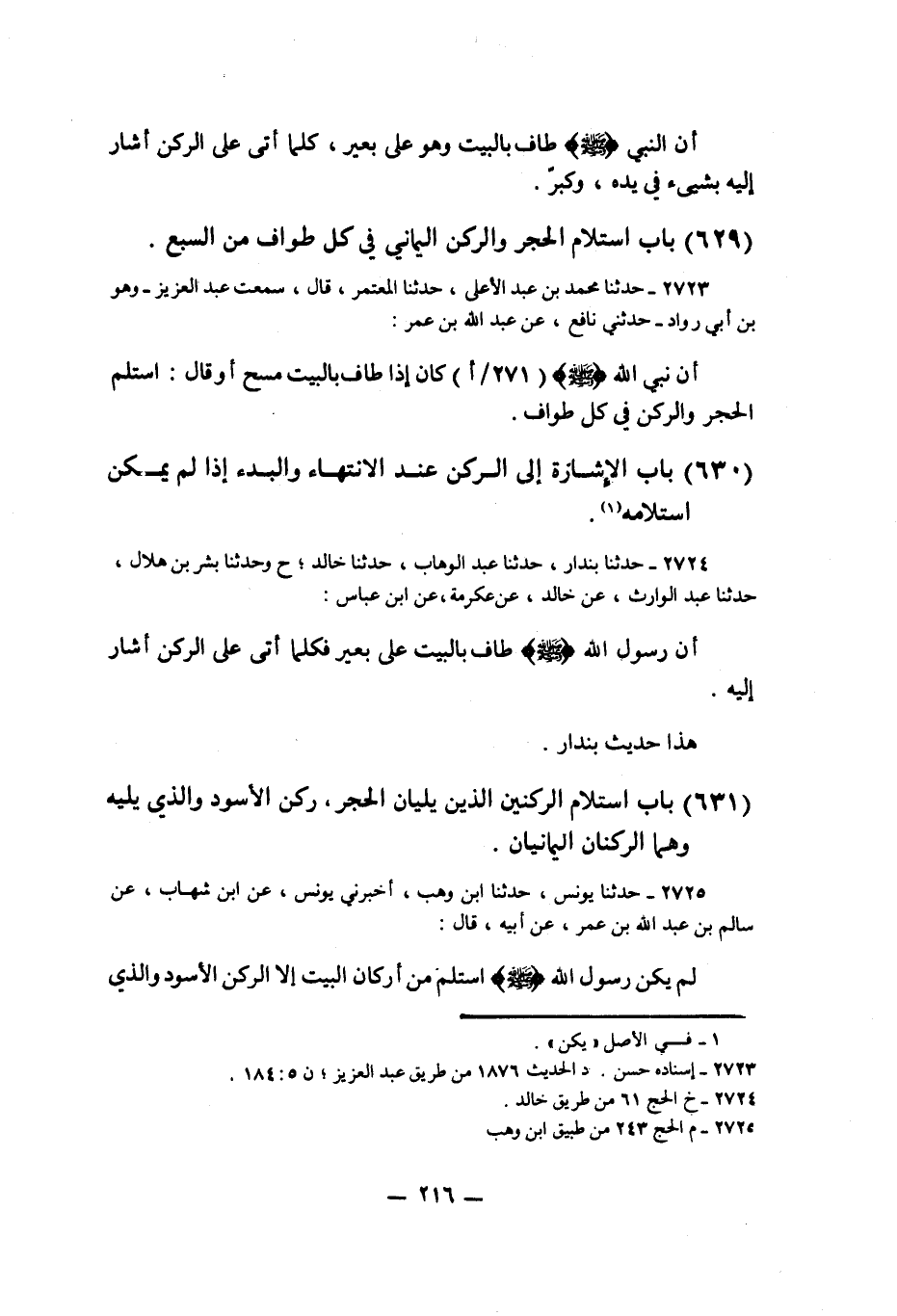 2723 - حَدَّثَنَا مُحَمَّدُ بْنُ عَبْدِ الْأَعْلَى، حَدَّثَنَا الْمُعْتَمِرُ قَالَ سَمِعْتُ عَبْدَ الْعَزِيزِ وَهُوَ ابْنُ أَبِي رَوَّادٍ، حَدَّثَنِي نَافِعٌ، عَنْ عَبْدِ اللَّهِ بْنِ عُمَرَ، أَنَّ نَبِيَّ اللَّهِ صَلَّى اللهُ عَلَيْهِ وَسَلَّمَ كَانَ §إِذَا طَافَ بِالْبَيْتِ مَسَحَ أَوْ قَالَ: اسْتَلَمَ الْحَجَرَ، وَالرُّكْنَ فِي كُلِّ طَوَافٍK2723 - قال الأعظمي: إسناده حسن