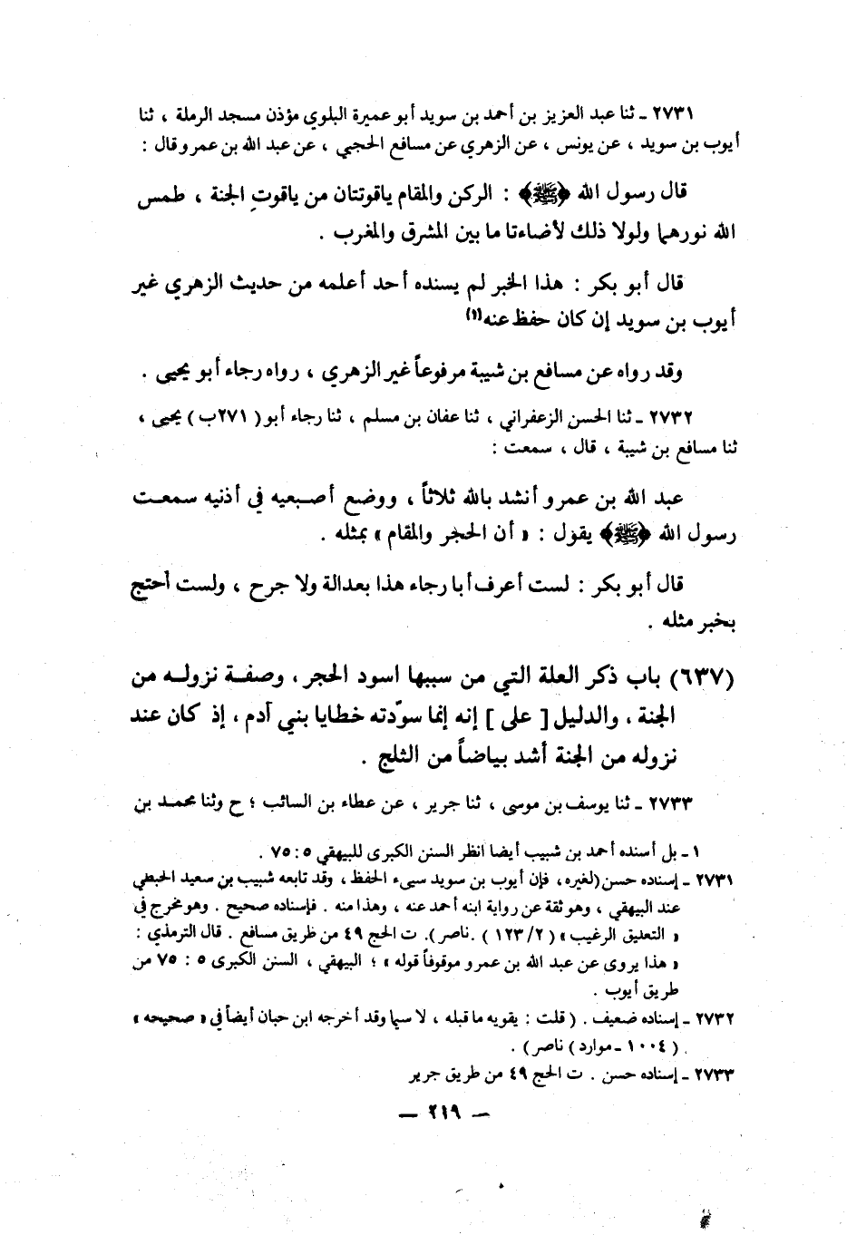 2733 - ثنا يُوسُفُ بْنُ مُوسَى، ثنا جَرِيرٌ، عَنْ عَطَاءِ بْنِ السَّائِبِ، ح وَثنا مُحَمَّدُ بْنُ مُوسَى الْحَرَشِيُّ، وَزِيَادُ بْنُ عَبْدِ اللَّهِ، ثنا عَطَاءُ بْنُ السَّائِبِ، عَنْ سَعِيدِ بْنِ جُبَيْرٍ، عَنِ ابْنِ عَبَّاسٍ، عَنِ النَّبِيِّ صَلَّى اللهُ عَلَيْهِ وَسَلَّمَ قَالَ: §نَزَلَ الْحَجَرُ الْأَسْوَدُ مِنَ الْجَنَّةِ أَشَدَّ بَيَاضًا مِنَ الثَّلْجِ فَسَوَّدَتْهُ خَطَايَا بَنِي آدَمَ "K2733 - قال الأعظمي: إسناده حسن