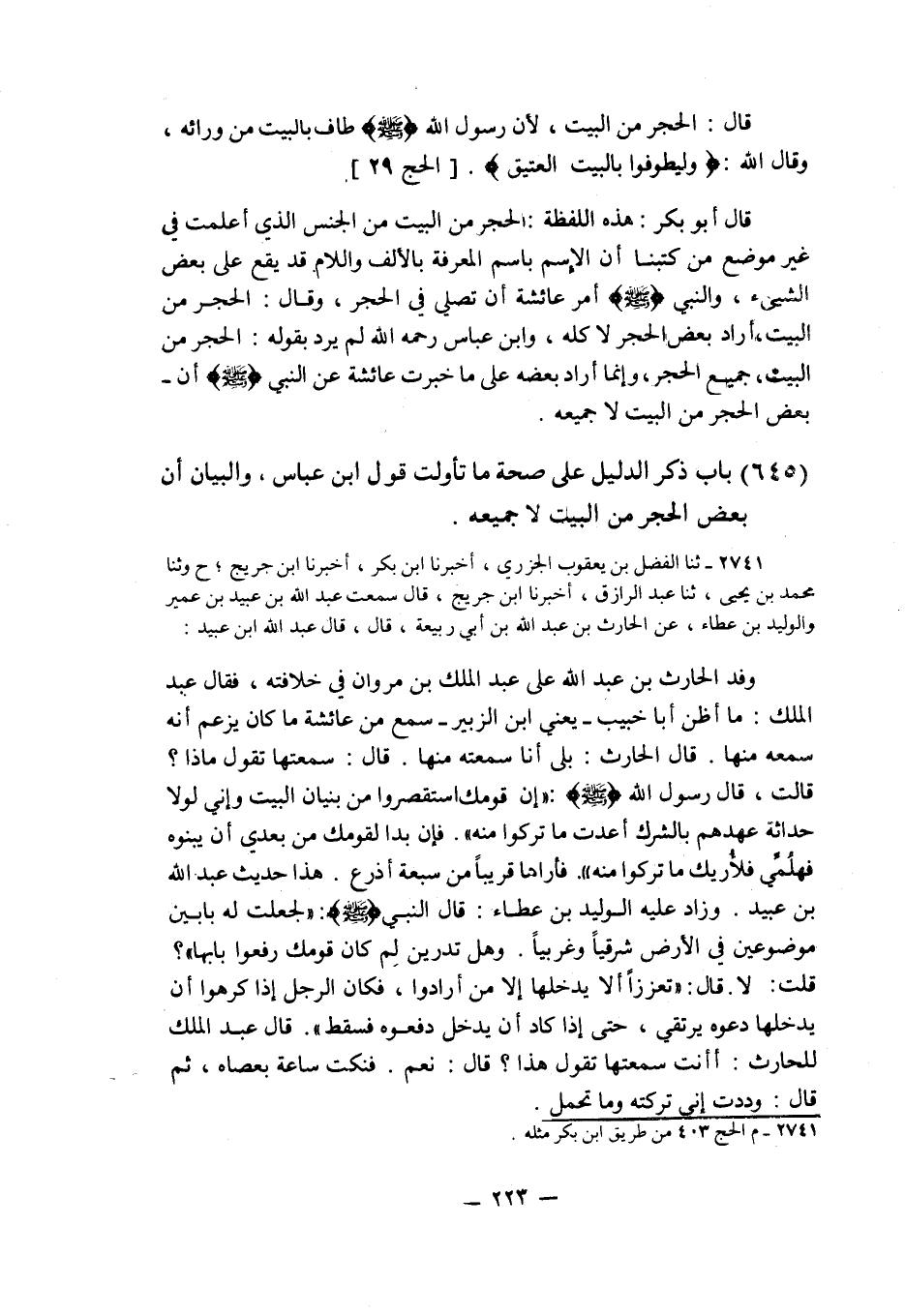 2741 - ثنا الْفَضْلُ بنُ يَعْقُوبَ الْجَزَرِيُّ، أَخْبَرَنَا ابنُ بَكْرٍ، أَخْبَرَنَا ابْنُ جُرَيْجٍ، حَ وثنا مُحَمَّدُ بْنُ يَحْيَى، ثنا عَبْدُ الرَّزَّاقِ، أَخْبَرَنَا ابْنُ جُرَيْجٍ قَالَ: سَمِعْتُ عَبْدَ اللَّهِ بْنَ عُبَيْدِ بْنِ عُمَيْرٍ، وَالْوَلِيدَ بْنَ عَطَاءٍ، عَنِ الْحَارِثِ بْنِ عَبْدِ اللَّهِ بْنِ أَبِي رَبِيعَةَ قَالَ: قَالَ عَبْدُ اللَّهِ بْنُ عُبَيْدٍ: وَفَدَ الْحَارِثُ بْنُ عَبْدِ اللَّهِ عَلَى عَبْدِ الْمَلِكِ بْنِ مَرْوَانَ فِي خِلَافَتِهِ، فَقَالَ عَبْدُ الْمَلَكِ: مَا أَظُنُّ أَبَا خُبَيْبٍ يَعْنِي ابْنَ الزُّبَيْرِ سَمِعَ مِنْ عَائِشَةَ مَا كَانَ يَزْعُمُ أَنَّهُ سَمِعَهُ مِنْهَا قَالَ الْحَارِثُ: بَلَى أَنَا سَمِعْتُهُ مِنْهَا، قَالَ: سَمِعْتَهَا تَقُولُ مَاذَا؟ قَالَتْ: قَالَ رَسُولُ اللَّهِ صَلَّى اللهُ عَلَيْهِ وَسَلَّمَ: «§إِنَّ قَوْمَكِ اسْتَقْصَرُوا مِنْ بُنْيَانِ الْبَيْتِ، وَإِنِّي لَوْلَا حَدَاثَةُ عَهْدِهِمْ بِالشِّرْكِ أَعَدْتُ مَا تَرَكُوا مِنْهُ فَإِنْ بَدَا لِقَوْمِكِ مِنْ بَعْدِي أَنْ يَبْنُوهُ فَهَلُمِّي، فَلَأُرِيكِ مَا تَرَكُوا مِنْهُ» ، فَأَرَاهَا قَرِيبًا مِنْ سَبْعَةِ أَذْرُعٍ هَذَا حَدِيثُ عَبْدِ اللَّهِ بْنِ عُبَيْدٍ، وَزَادَ عَلَيْهِ الْوَلِيدُ بْنُ عَطَاءٍ قَالَ النَّبِيُّ صَلَّى اللهُ عَلَيْهِ وَسَلَّمَ: «لَجَعَلْتُ لَهُ بَابَيْنِ مَوْضُوعَيْنِ فِي الْأَرْضِ شَرْقِيًّا وَغَرْبِيًّا، وَهَلْ تَدْرِينَ لِمَ كَانَ قَوْمُكِ رَفَعُوا بَابَهَا؟» قُلْتُ: لَا قَالَ: «تَعَزُّزًا أَلَا يَدْخُلَهَا إِلَّا مَنْ أَرَادُوا، فَكَانَ الرَّجُلُ إِذَا كَرِهُوا أَنْ يَدْخُلَهَا دَعُوهُ يَرْتَقِي حَتَّى إِذَا كَادَ أَنْ يَدْخُلَ دَفَعُوهُ فَسَقَطَ» قَالَ عَبْدُ الْمَلِكِ لِلْحَارِثِ: أَأَنْتَ سَمِعْتَهَا تَقُولُ هَذَا؟ قَالَ: نَعَمْ فَنَكَتَ سَاعَةً بِعَصَاهُ، ثُمَّ قَالَ: وَدِدْتُ أَنِّي تَرَكْتُهُ، وَمَا تَحَمَّلَ، جَمِيعًا لَفْظًا وَاحِدًا غَيْرَ أَنَّ مُحَمَّدًا قَالَ الْوَلِيدُ بْنُ عَطَاءِ بْنِ جَنَابٍ، وَقَالَ: قَالَ الْحَارِثِ: أَنَا سَمِعْتُهُ مِنْهَا قَالَ: فَكَانَ الْحَارِثُ مُصَدَّقًا لَا يُكَذَّبُ قَالَ: سَمِعْتَهَا تَقُولُ مَاذَا؟ قَالَ: سَمِعْتُهَا تَقُولُ قَالَ رَسُولُ اللَّهِ صَلَّى اللهُ عَلَيْهِ وَسَلَّمَ، وَقَالَ: «لَجَعَلْتُ لَهَا بَابَيْنِ» وَقَالَ: «يَدَعُونَهُ يَرْتَقِي»