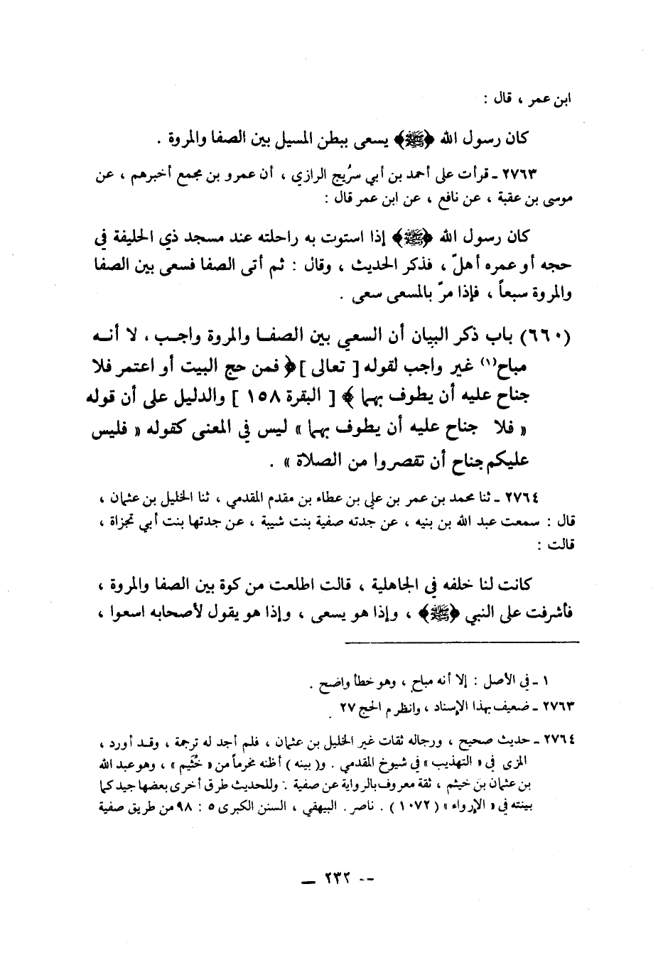 §بَابُ ذِكْرِ الْبَيَانِ أَنَّ السَّعْيَ بَيْنَ الصَّفَا وَالْمَرْوَةِ وَاجِبٌ، لَا أَنَّهُ مُبَاحٌ غَيْرُ وَاجِبٍ لِقَوْلِهِ تَعَالَى: {فَمَنْ حَجَّ الْبَيْتَ أَوِ اعْتَمَرَ فَلَا جُنَاحَ عَلَيْهِ أَنْ يَطَّوَّفَ بِهِمَا} [البقرة: 158] ، وَالدَّلِيلِ عَلَى أَنَّ قَوْلَهُ: {فَلَا جُنَاحَ عَلَيْهِ أَنْ يَطَّوَّفَ بِهِمَا} [البقرة: 158] " لَيْسَ فِي الْمَعْنَى كَقَوْلِهِ: {فَلَيْسَ عَلَيْكُمْ جُنَاحٌ أَنْ تَقْصُرُوا مِنَ الصَّلَاةِ} [النساء: 101]