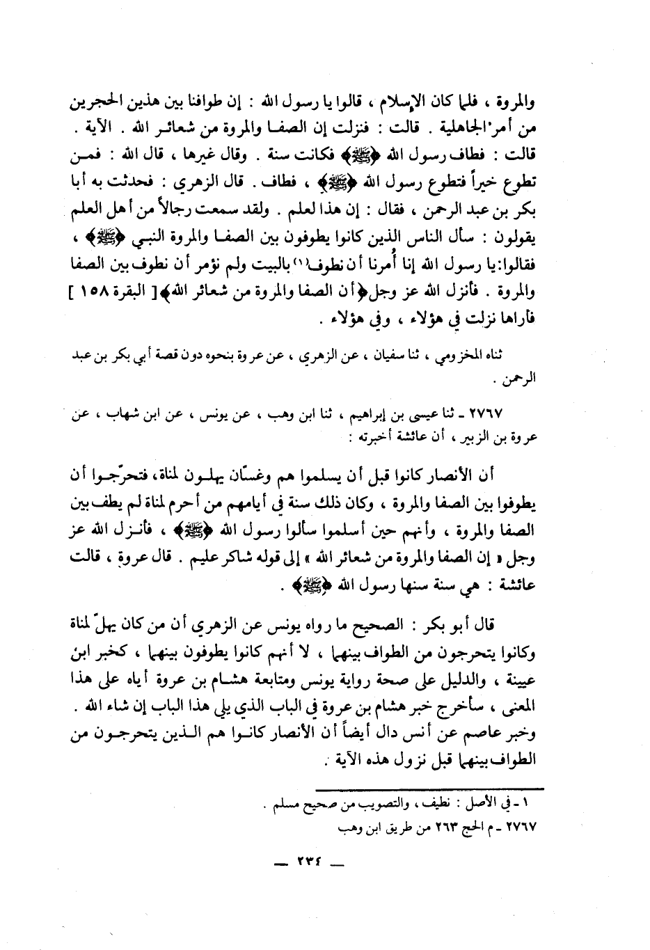 2767 - ثنا عِيسَى بْنُ إِبْرَاهِيمَ، ثنا ابْنُ وَهْبٍ، عَنْ يُونُسَ، عَنِ ابْنِ شِهَابٍ، عَنْ عُرْوَةَ بْنِ الزُّبَيْرِ أَنَّ عَائِشَةَ، أَخْبَرَتْهُ أَنَّ الْأَنْصَارَ كَانُوا §قَبْلَ أَنْ يُسْلِمُوا هُمْ وَغَسَّانُ يُهِلُّونَ لِمَنَاةَ فَتَحَرَّجُوا أَنْ يَطَّوَّفُوا بَيْنَ الصَّفَا وَالْمَرْوَةِ وَكَانَ ذَلِكَ سُنَّةً فِي أَيَّامِهِمْ مَنْ أَحْرَمَ لِمَنَاةَ لَمْ يَطُفْ بَيْنَ الصَّفَا وَالْمَرْوَةِ، وَأَنَّهُمْ حِينَ أَسْلَمُوا سَأَلُوا رَسُولَ اللَّهِ صَلَّى اللهُ عَلَيْهِ وَسَلَّمَ فَأَنْزَلَ اللَّهُ عَزَّ وَجَلَّ {إِنَّ الصَّفَا وَالْمَرْوَةَ مِنْ شَعَائِرِ اللَّهِ} [البقرة: 158] إِلَى قَوْلِهِ {شَاكِرٌ عَلِيمٌ} [البقرة: 158] قَالَ عُرْوَةُ قَالَتْ عَائِشَةُ: هِيَ سُنَّةٌ سَنَّهَا رَسُولُ اللَّهِ صَلَّى اللهُ عَلَيْهِ وَسَلَّمَ قَالَ أَبُو بَكْرٍ: الصَّحِيحُ مَا رَوَاهُ يُونُسُ عَنِ الزُّهْرِيِّ أَنَّ مَنْ كَانَ يُهِلُّ لِمَنَاةَ، وَكَانُوا يَتَحَرَّجُونَ مِنَ الطَّوَافِ بَيْنَهُمَا لَا أَنَّهُمُ كَانُوا يَطُوفُونَ بَيْنَهُمَا كَخَبَرِ ابْنِ عُيَيْنَةَ، وَالدَّلِيلُ عَلَى صِحَّةِ رِوَايَةِ يُونُسَ، وَمُتَابَعَةِ هِشَامِ بْنِ عُرْوَةَ إِيَّاهُ عَلَى هَذَا الْمَعْنَى سَأُخَرَّجُ خَبَرَ هِشَامِ بْنِ عُرْوَةَ فِي الْبَابِ الَّذِي يَلِي هَذَا الْبَابَ إِنْ شَاءَ اللَّهُ، وَخَبَرُ عَاصِمٍ عَنْ أَنَسٍ دَالٌ أَيْضًا أَنَّ الْأَنْصَارَ كَانُوا هُمُ الَّذِينَ يَتَحَرَّجُونَ مِنَ الطَّوَافِ بَيْنَهُمَا قَبْلَ نُزُولِ هَذِهِ الْآيَةِ