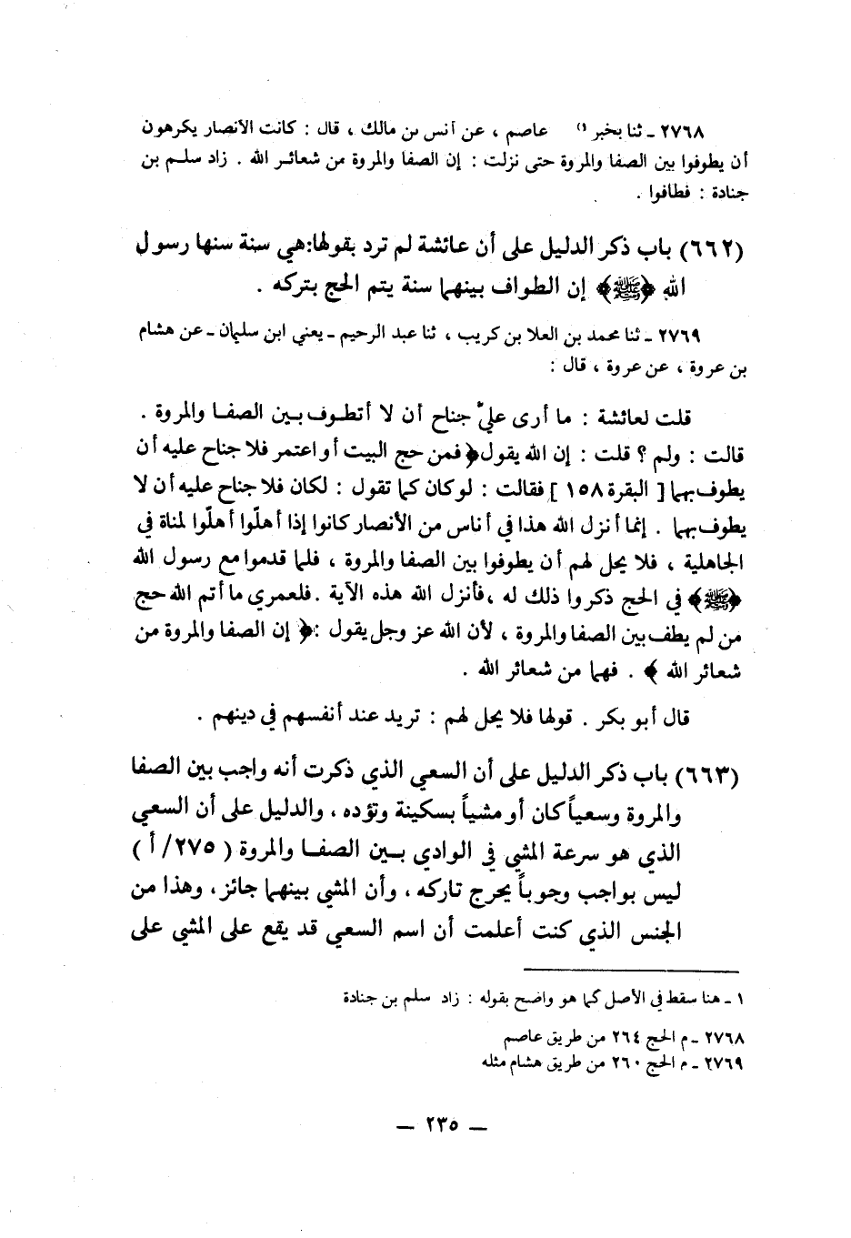 2769 - ثنا مُحَمَّدُ بْنُ الْعَلَاءِ بْنِ كُرَيْبٍ، ثنا عَبْدُ الرَّحِيمِ يَعْنِي ابْنَ سُلَيْمَانَ، عَنْ هِشَامِ بْنِ عُرْوَةَ، عَنْ عُرْوَةَ قَالَ قُلْتُ لِعَائِشَةَ: §مَا أَرَى عَلَيَّ مِنْ جُنَاحٍ أَنْ لَا أَتَطَوَّفَ بَيْنَ الصَّفَا وَالْمَرْوَةِ قَالَتْ: وَلِمَ؟ قُلْتُ: إِنَّ اللَّهَ يَقُولُ {فَمَنْ حَجَّ الْبَيْتَ أَوِ اعْتَمَرَ فَلَا جُنَاحَ عَلَيْهِ أَنْ يَطَّوَّفَ بِهِمَا} [البقرة: 158] ، فَقَالَتْ: لَوْ كَانَ كَمَا تَقُولُ لَكَانَ، {فَلَا جُنَاحَ عَلَيْهِ أَنْ لَا يَطَّوَّفَ بِهِمَا} إِنَّمَا أَنْزَلَ اللَّهُ هَذَا فِي أُنَاسٍ مِنَ الْأَنْصَارِ كَانُوا إِذَا أَهَلُّوا أَهَلُّوا لِمَنَاةَ فِي الْجَاهِلِيَّةِ، فَلَا يَحِلُّ لَهُمْ أَنْ يَطَّوَّفُوا بَيْنَ الصَّفَا وَالْمَرْوَةِ، فَلَمَّا قَدِمُوا مَعَ رَسُولِ اللَّهِ صَلَّى اللهُ عَلَيْهِ وَسَلَّمَ فِي الْحَجِّ ذَكَرُوا ذَلِكَ لَهُ، فَأَنْزَلَ اللَّهُ هَذِهِ الْآيَةَ، فَلَعَمْرِي مَا أَتَمَّ اللَّهُ حَجَّ مَنْ لَمْ يَطُفْ بَيْنَ الصَّفَا وَالْمَرْوَةِ؛ لِأَنَّ اللَّهَ عَزَّ وَجَلَّ يَقُولُ: {إِنَّ الصَّفَا وَالْمَرْوَةَ مِنْ شَعَائِرِ اللَّهِ} [البقرة: 158] فَهُمَا مِنْ شَعَائِرِ اللَّهِ " قَالَ أَبُو بَكْرٍ: قَوْلُهَا فَلَا يَحِلُّ لَهُمْ تُرِيدُ عِنْدَ أَنْفُسِهِمْ فِي دِينِهِمْ
