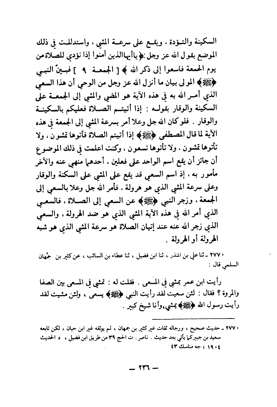 2770 - ثنا عَلِيُّ بْنُ مُنْذِرٍ، ثنا ابْنُ فُضَيْلٍ، ثنا عَطَاءُ بْنُ السَّائِبِ، عَنْ كَثِيرِ بْنِ جُمْهَانَ السُّلَمِيِّ قَالَ: §رَأَيْتُ ابْنَ عُمَرَ يَمْشِي فِي الْمَسْعَى، فَقُلْتُ لَهُ تَمْشِي فِي الْمَسْعَى بَيْنَ الصَّفَا وَالْمَرْوَةِ، فَقَالَ: لَئِنْ سَعَيْتُ لَقَدْ رَأَيْتُ النَّبِيَّ صَلَّى اللهُ عَلَيْهِ وَسَلَّمَ يَسْعَى، وَلَئِنْ مَشَيْتُ لَقَدْ رَأَيْتُ رَسُولَ اللَّهِ صَلَّى اللهُ عَلَيْهِ وَسَلَّمَ يَمْشِي، وَأَنَا شَيْخٌ كَبِيرٌK2770 - قال الألباني: حديث صحيح ورجاله ثقات غير كثير بن جهمان لم يوثقه غير ابن حبان لكن تابعه سعيد بن جبير كما يأتي بعد حديث