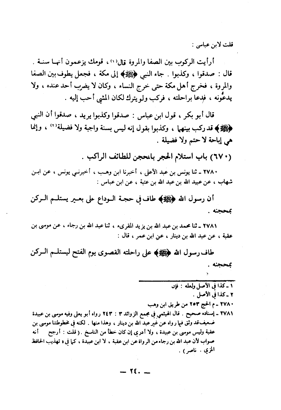 2781 - ثنا مُحَمَّدُ بْنُ عَبْدِ اللَّهِ بْنِ يَزِيدَ الْمُقْرِئُ، ثنا عَبْدُ اللَّهِ بْنُ رَجَاءٍ، عَنْ مُوسَى بْنِ عُقْبَةَ، عَنْ عَبْدِ اللَّهِ بْنِ دِينَارٍ، عَنِ ابْنِ عُمَرَ قَالَ: §طَافَ رَسُولُ اللَّهِ صَلَّى اللهُ عَلَيْهِ وَسَلَّمَ عَلَى رَاحِلَتِهِ الْقَصْوَى يَوْمَ الْفَتْحِ لِيَسْتَلِمَ الرُّكْنَ بِمِحْجَنِهِK2781 - قال الأعظمي: إسناده صحيح