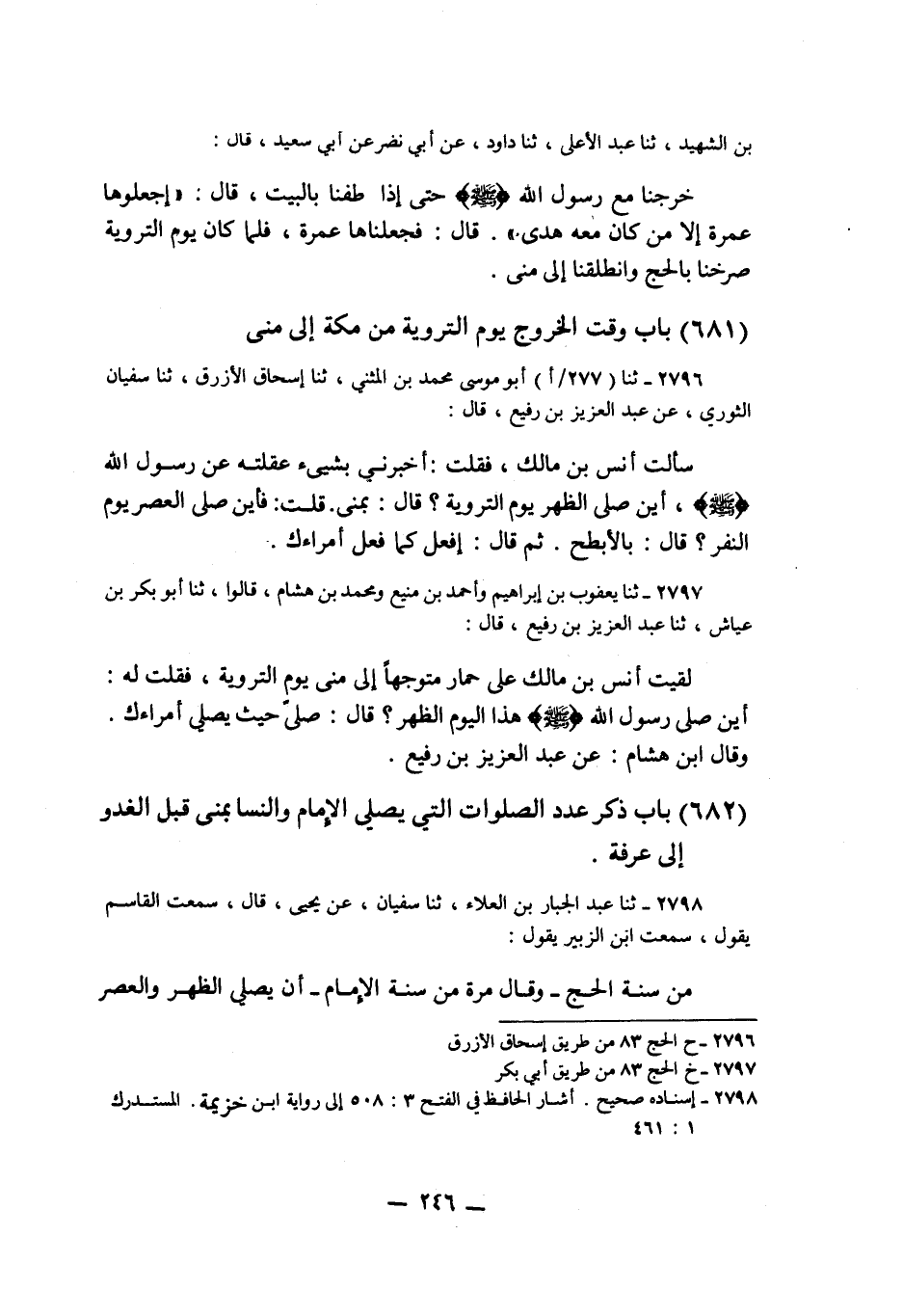 2797 - ثنا يَعْقُوبُ بْنُ إِبْرَاهِيمَ، وَأَحْمَدُ بْنُ مَنِيعٍ، وَمُحَمَّدُ بْنُ هِشَامٍ قَالُوا: ثنا أَبُو بَكْرِ بْنُ عَيَّاشٍ، ثنا عَبْدُ الْعَزِيزِ بْنُ رُفَيْعٍ قَالَ: لَقِيتُ أَنَسَ بْنَ مَالِكٍ عَلَى حِمَارٍ مُتَوَجِّهًا إِلَى مِنًى يَوْمَ التَّرْوِيَةِ فَقُلْتُ لَهُ: §أَيْنَ صَلَّى رَسُولُ اللَّهِ صَلَّى اللهُ عَلَيْهِ وَسَلَّمَ هَذَا الْيَوْمَ الظُّهْرَ؟ قَالَ: صَلَّى حَيْثُ يُصَلِّي أُمَرَاؤُكَ، وَقَالَ ابْنُ هِشَامٍ عَنْ عَبْدِ الْعَزِيزِ بْنِ رُفَيْعٍ