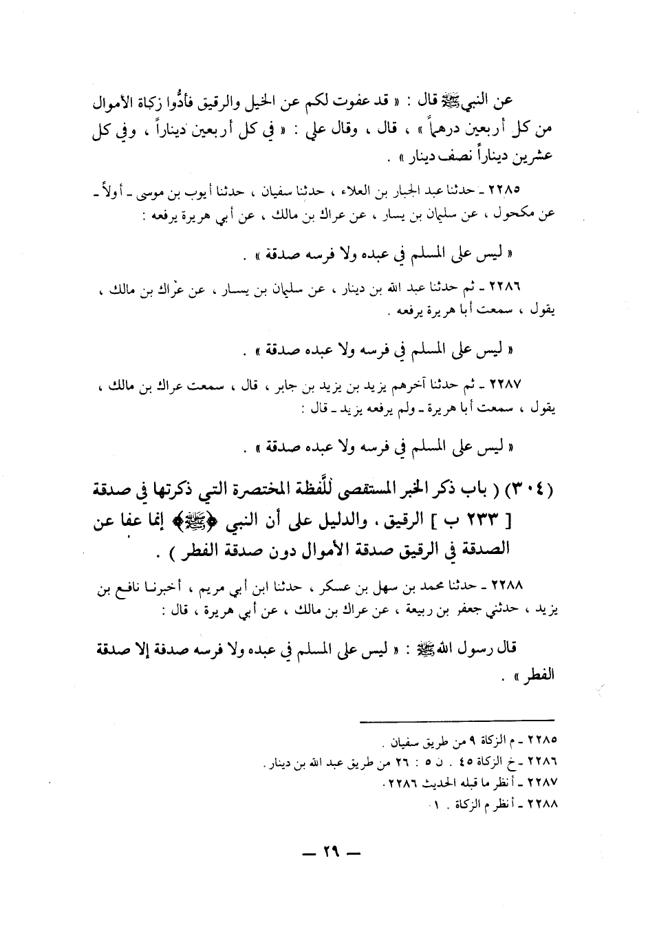 2286 - ثُمَّ حَدَّثَنَا عَبْدُ اللَّهِ بْنُ دِينَارٍ، عَنْ سُلَيْمَانَ بْنِ يَسَارٍ، عَنْ عِرَاكِ بْنِ مَالِكٍ يَقُولُ: سَمِعْتُ أَبَا هُرَيْرَةَ، يَرْفَعُهُ، «§لَيْسَ عَلَى الْمُسْلِمِ فِي فَرَسِهِ، وَلَا عَبْدِهِ صَدَقَةٌ»
