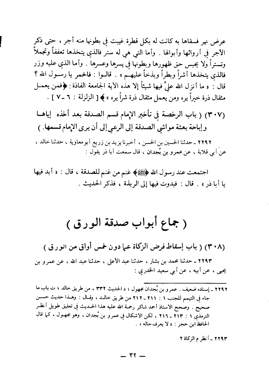2292 - حَدَّثَنَا الْحُسَيْنُ بْنُ الْحَسَنِ، أَخْبَرَنَا يَزِيدُ بْنُ زُرَيْعٍ أَبُو مُعَاوِيَةَ، حَدَّثَنَا خَالِدٌ، عَنْ أَبِي قِلَابَةَ، عَنْ عَمْرِو بْنِ بُجْدَانَ قَالَ: سَمِعْتُ أَبَا ذَرٍّ يَقُولُ: §اجْتَمَعَتْ عِنْدَ رَسُولِ اللَّهِ صَلَّى اللهُ عَلَيْهِ وَسَلَّمَ غَنَمٌ مِنْ غَنَمٍ لِلصَّدَقَةِ قَالَ: «ابْدُ فِيهَا يَا أَبَا ذَرٍّ» قَالَ: فَبَدَوْتُ فِيهَا إِلَى الرَّبَذَةِ، فَذَكَرَ الْحَدِيثَK2292 - قال الأعظمي: إسناده ضعيف عمرو بن بجدان مجهول وأخرجه أبو داود 332 والترمذي من طريق خالد وقال حديث حسن صحيح وصحح الأستاذ أحمد شاكر رحمه الله هذا الحديث في تعليق طويل (الترمذي 1 / 213 - 216) لكن الإشكال في عمرو بن بجدان وهو مجهول كما قال الحافظ: لا يعرف حاله