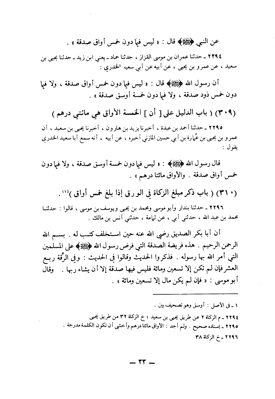2294 - حَدَّثَنَا عِمْرَانُ بْنُ مُوسَى الْقَزَّازُ، حَدَّثَنَا حَمَّادُ يَعْنِي ابْنَ زَيْدٍ، حَدَّثَنَا يَحْيَى بْنُ سَعِيدٍ، عَنْ عَمْرِو بْنِ يَحْيَى، عَنْ أَبِيهِ، عَنْ أَبِي سَعِيدٍ الْخُدْرِيِّ، أَنَّ رَسُولَ اللَّهِ صَلَّى اللهُ عَلَيْهِ وَسَلَّمَ قَالَ: «§لَيْسَ فِيمَا دُونَ خَمْسِ أَوَاقٍ صَدَقَةٌ، وَلَا فِيمَا دُونَ خَمْسِ ذَوْدٍ صَدَقَةٌ، وَلَا فِيمَا دُونَ خَمْسَةِ أَوْسُقٍ صَدَقَةٌ»