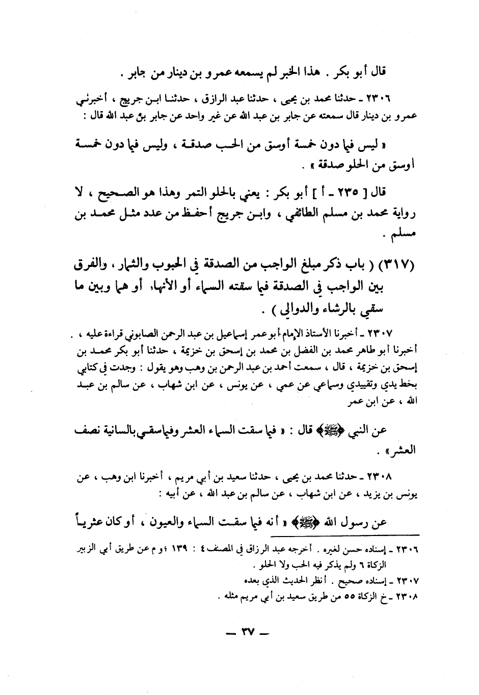 2306 - حَدَّثَنَا مُحَمَّدُ بْنُ يَحْيَى، حَدَّثَنَا عَبْدُ الرَّزَّاقِ، حَدَّثَنَا ابْنُ جُرَيْجٍ، أَخْبَرَنِي عَمْرُو بْنُ دِينَارٍ قَالَ: سَمِعْتُهُ، عَنْ جَابِرِ بْنِ عَبْدِ اللَّهِ، عَنْ غَيْرِ وَاحِدٍ، عَنْ جَابِرِ بْنِ عَبْدِ اللَّهِ قَالَ: «§لَيْسَ فِيمَا دُونَ خَمْسَةِ أَوْسُقٍ مِنَ الْحَبِّ صَدَقَةٌ، وَلَيْسَ فِيمَا دُونَ خَمْسَةِ أَوْسُقٍ مِنَ الْحُلْوِ صَدَقَةٌ» قَالَ أَبُو بَكْرٍ: «يَعْنِي بِالْحُلْوِ التَّمْرَ، وَهَذَا هُوَ الصَّحِيحُ، لَا رِوَايَةَ مُحَمَّدِ بْنِ مُسْلِمٍ الطَّائِفِيِّ، وَابْنُ جُرَيْجٍ أَحْفَظُ مِنْ عَدَدٍ مِثْلِ مُحَمَّدِ بْنِ مُسْلِمٍ» K2306 - قال الأعظمي: إسناده حسن لغيره