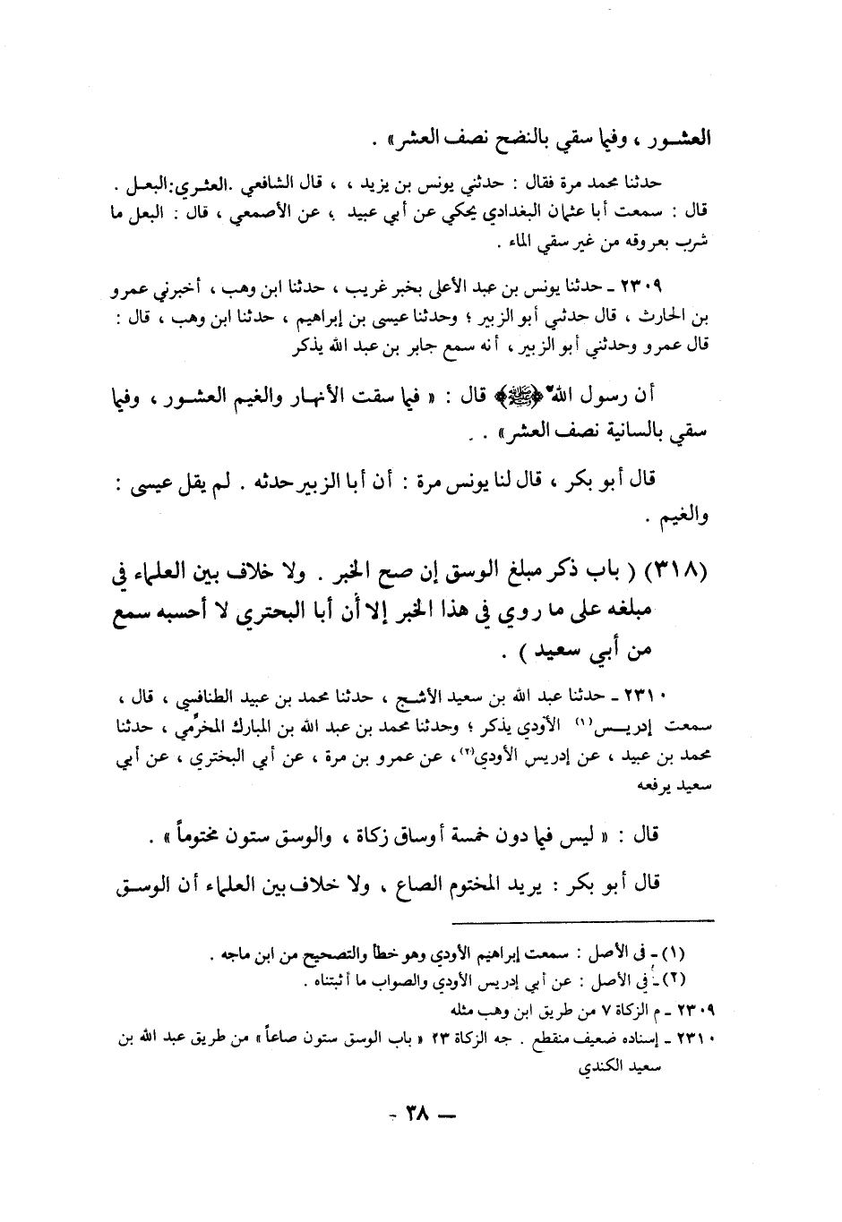 2310 - حَدَّثَنَا عَبْدُ اللَّهِ بْنُ سَعِيدٍ الْأَشَجُّ، حَدَّثَنَا مُحَمَّدُ بْنُ عُبَيْدٍ الطَّنَافِسِيُّ قَالَ: سَمِعْتُ إِدْرِيسَ الْأَوْدِيَّ، يَذْكُرُ، وَحَدَّثَنَا مُحَمَّدُ بْنُ عَبْدِ اللَّهِ بْنِ الْمُبَارَكِ الْمُخَرِّمِيُّ، حَدَّثَنَا مُحَمَّدُ بْنُ عُبَيْدٍ، عَنْ إِدْرِيسَ الْأَوْدِيِّ، عَنْ عَمْرِو بْنِ مُرَّةَ، عَنْ أَبِي الْبَخْتَرِيِّ، عَنْ أَبِي سَعِيدٍ، يَرْفَعُهُ قَالَ: «§لَيْسَ فِيمَا دُونَ خَمْسَةِ أَوْسَاقٍ زَكَاةٌ» . وَالْوَسْقُ: سِتُّونَ مَخْتُومًا قَالَ أَبُو بَكْرٍ: «يُرِيدُ الْمَخْتُومُ، الصَّاعُ، وَلَا خِلَافَ بَيْنَ الْعُلَمَاءِ أَنَّ الْوَسْقَ سِتُّونَ صَاعًا، وَقَدْ بَيَّنْتُ مَبْلَغَ الصَّاعِ فِي كِتَابِ الْأَيْمَانِ وَالنُّذُورِ فِي ذِكْرِ كَفَّارَةِ الْيَمِينِ» K2310 - قال الأعظمي: إسناده ضعيف منقطع