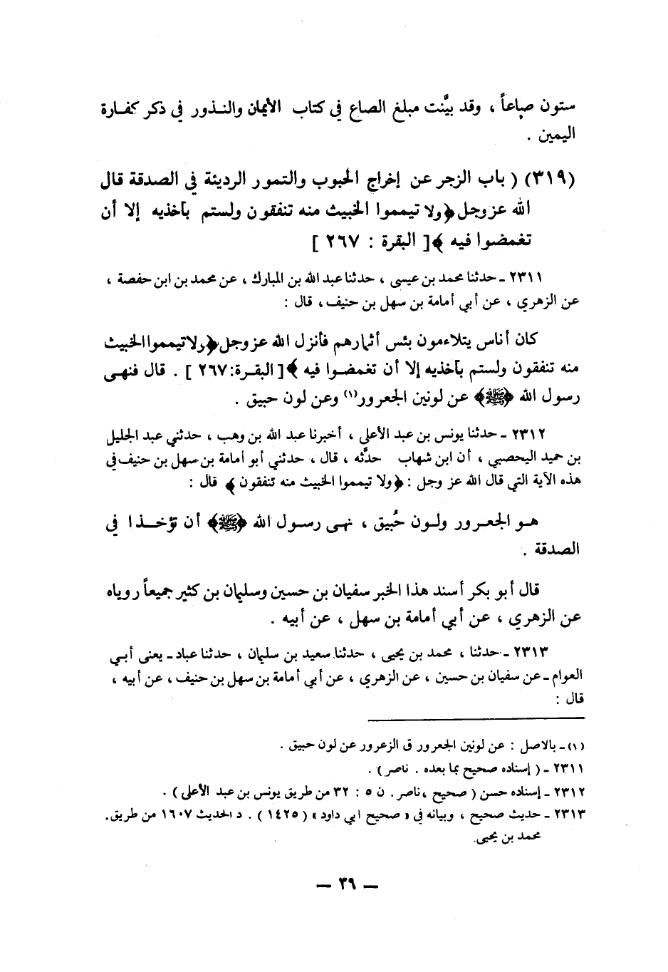 2312 - حَدَّثَنَا يُونُسُ بْنُ عَبْدِ الْأَعْلَى، أَخْبَرَنَا عَبْدُ اللَّهِ بْنُ وَهْبٍ، حَدَّثَنِي عَبْدُ الْجَلِيلِ بْنُ حُمَيْدٍ الْيَحْصِبِيُّ، أَنَّ ابْنَ شِهَابٍ حَدَّثَهُ قَالَ: حَدَّثَنِي أَبُو أُمَامَةَ بْنُ سَهْلِ بْنِ حُنَيْفٍ، فِي هَذِهِ الْآيَةِ الَّتِي قَالَ اللَّهُ عَزَّ وَجَلَّ: {وَلَا تَيَمَّمُوا الْخَبِيثَ مِنْهُ تُنْفِقُونَ} [البقرة: 267] قَالَ: «هُوَ §الْجُعْرُورُ وَلَوْنُ حُبَيْقٍ نَهَى رَسُولُ اللَّهِ صَلَّى اللهُ عَلَيْهِ وَسَلَّمَ أَنْ تُؤْخَذَا فِي الصَّدَقَةِ» . قَالَ أَبُو بَكْرٍ: «أَسْنَدَ هَذَا الْخَبَرَ سُفْيَانُ بْنُ حُسَيْنٍ، وَسُلَيْمَانُ بْنُ كَثِيرٍ جَمِيعًا» رَوَيَاهُ، عَنِ الزُّهْرِيِّ، عَنْ أَبِي أُمَامَةَ بْنِ سَهْلٍ، عَنْ أَبِيهِK2312 - قال الألباني: إسناده حسن صحيح