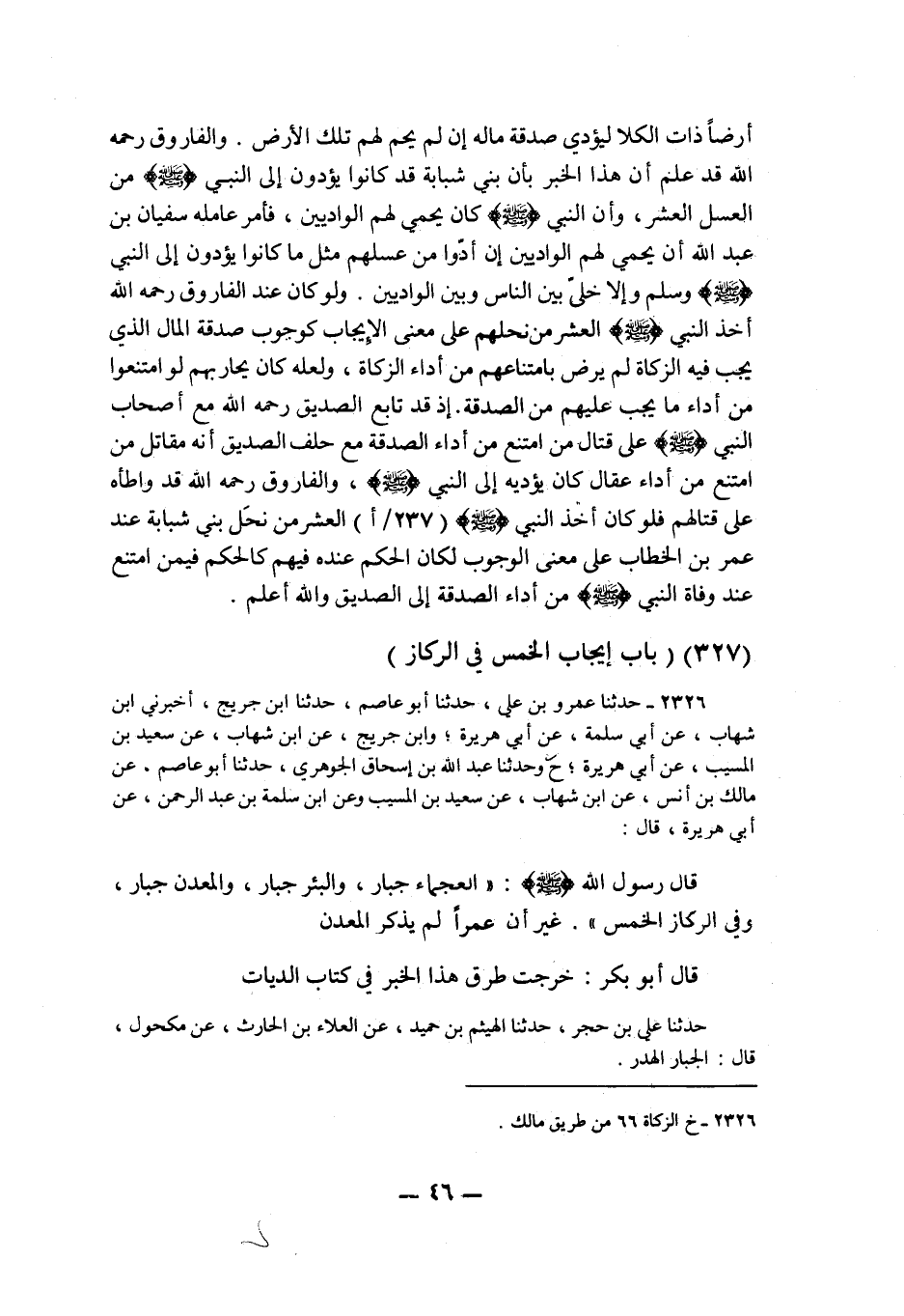 2326 - حَدَّثَنَا عَمْرُو بْنُ عَلِيٍّ، حَدَّثَنَا أَبُو عَاصِمٍ، حَدَّثَنَا ابْنُ جُرَيْجٍ، أَخْبَرَنِي ابْنُ شِهَابٍ، عَنْ أَبِي سَلَمَةَ، عَنْ أَبِي هُرَيْرَةَ، وَابْنُ جُرَيْجٍ، عَنِ ابْنِ شِهَابٍ، عَنْ سَعِيدِ بْنِ الْمُسَيِّبِ، عَنْ أَبِي هُرَيْرَةَ، ح وَحَدَّثَنَا عَبْدُ اللَّهِ بْنُ إِسْحَاقَ الْجَوْهَرِيُّ، حَدَّثَنَا أَبُو عَاصِمٍ، عَنْ مَالِكِ بْنِ أَنَسٍ، عَنِ ابْنِ شِهَابٍ، عَنْ سَعِيدِ بْنِ الْمُسَيِّبِ، وَعَنِ ابْنِ سَلَمَةَ بْنِ عَبْدِ الرَّحْمَنِ، عَنْ أَبِي هُرَيْرَةَ قَالَ: قَالَ رَسُولُ اللَّهِ صَلَّى اللهُ عَلَيْهِ وَسَلَّمَ: «§الْعَجْمَاءُ جُبَارٌ، وَالْبِئْرُ جُبَارٌ، وَالْمَعْدِنُ جُبَارٌ، وَفِي الرِّكَازُ الْخُمُسِ» . غَيْرَ أَنَّ عَمْرًا لَمْ يَذْكُرِ الْمَعْدِنَ. قَالَ أَبُو بَكْرٍ: «خَرَّجْتُ طُرُقَ هَذَا الْخَبَرِ فِي كِتَابِ الدِّيَاتِ» . حَدَّثَنَا عَلِيُّ بْنُ حُجْرٍ، حَدَّثَنَا الْهَيْثَمُ بْنُ حُمَيْدٍ، عَنِ الْعَلَاءِ بْنِ الْحَارِثِ، عَنْ مَكْحُولٍ قَالَ: الْجُبَارُ: الْهَدْرُ ". حَدَّثَنَا يُونُسُ بْنُ عَبْدِ الْأَعْلَى، حَدَّثَنَا ابْنُ وَهْبٍ، ح، وَأَخْبَرَنِي ابْنُ عَبْدِ الْحَكَمِ، أَنَّ ابْنَ وَهْبٍ أَخْبَرَهُمْ، عَنْ يُونُسَ قَالَ: قَالَ ابْنُ شِهَابٍ: الْجُبَارُ: الَّذِي لَا دِيَةَ لَهُ ". سَمِعْتُ مُحَمَّدَ بْنَ يَحْيَى يَحْكِي، عَنِ إِسْحَاقَ بْنِ عِيسَى بْنِ الطَّبَّاعِ قَالَ: قَالَ مَالِكٌ: الْجُبَارُ: الَّذِي لَا دِيَةَ لَهُ