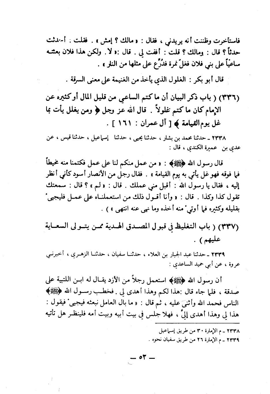 2339 - حَدَّثَنَا عَبْدُ الْجَبَّارِ بْنُ الْعَلَاءِ، حَدَّثَنَا سُفْيَانُ، حَدَّثَنَا الزُّهْرِيُّ، أَخْبَرَنِي عُرْوَةُ، عَنْ أَبِي حُمَيْدٍ السَّاعِدِيِّ، أَنَّ رَسُولَ اللَّهِ صَلَّى اللهُ عَلَيْهِ وَسَلَّمَ اسْتَعْمَلَ رَجُلًا مِنَ الْأَزْدِ يُقَالُ لَهُ: ابْنُ اللُّتْبِيَّةِ عَلَى صَدَقَةٍ، فَلَمَّا جَاءَ قَالَ: هَذَا لَكُمْ وَهَذَا أُهْدِيَ لِي، فَخَطَبَ رَسُولُ اللَّهِ صَلَّى اللهُ عَلَيْهِ وَسَلَّمَ النَّاسَ، فَحَمِدَ اللَّهَ وَأَثْنَى عَلَيْهِ، ثُمَّ قَالَ: " §مَا بَالُ الْعَامِلِ نَبْعَثُهُ فَيَجِيءُ فَيَقُولُ: هَذَا لِي وَهَذَا أُهْدِيَ إِلَيَّ فَهَلَّا جَلَسَ فِي بَيْتِ أَبِيهِ وَبَيْتِ أُمِّهِ، فَلْيَنْظُرْ هَلْ تَأْتِيهِ هَدِيَّةٌ أَمْ لَا، وَالَّذِي نَفْسُ مُحَمَّدٍ بِيَدِهِ لَا يَأْتِي أَحَدٌ مِنْكُمْ بِشَيْءٍ إِلَّا طِيفَ بِهِ يَوْمَ الْقِيَامَةِ يَحْمِلُهُ عَلَى عُنُقِهِ إِنْ كَانَ بَعِيرًا لَهُ رُغَاءٌ أَوْ بَقَرَةً لَهَا خُوَارٌ أَوْ ثَوْرًا لَهُ ثُوَارٌ - وَرُبَّمَا قَالَ: يَتْعَرُ - " قَالَ: ثُمَّ رَفَعَ يَدَيْهِ حَتَّى رَأَيْنَا عُفْرَتَيْ إِبْطَيْهِ، ثُمَّ قَالَ: «اللَّهُمَّ هَلْ بَلَّغْتُ ثَلَاثًا»