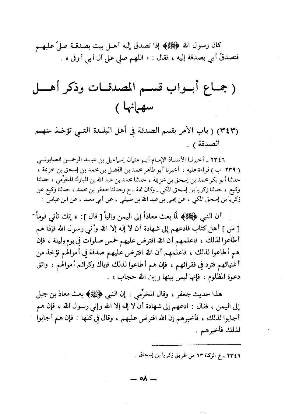 2346 - حَدَّثَنَا مُحَمَّدُ بْنُ عَبْدِ اللَّهِ بْنِ الْمُبَارَكِ الْمُخَرِّمِيُّ، حَدَّثَنَا وَكِيعٌ، حَدَّثَنَا زَكَرِيَّا بْنُ إِسْحَاقَ الْمَكِّيُّ، وَكَانَ ثِقَةً، ح وَحَدَّثَنَا جَعْفَرُ بْنُ مُحَمَّدٍ، حَدَّثَنَا وَكِيعٌ، عَنْ زَكَرِيَّا بْنِ إِسْحَاقَ الْمَكِّيِّ، عَنْ يَحْيَى بْنِ عَبْدِ اللَّهِ بْنِ صَيْفِيٍّ، عَنْ أَبِي مَعْبَدٍ، عَنِ ابْنِ عَبَّاسٍ، أَنَّ النَّبِيَّ صَلَّى اللهُ عَلَيْهِ وَسَلَّمَ لَمَّا بَعَثَ مُعَاذًا إِلَى الْيَمَنِ وَالِيًا قَالَ: «§إِنَّكَ تَأْتِي قَوْمًا مِنْ أَهْلِ كِتَابٍ، فَادْعُهُمْ إِلَى شَهَادَةِ أَنْ لَا لَهَ إِلَّا اللَّهُ، وَأَنِّي رَسُولُ اللَّهِ، فَإِذَا هُمْ أَطَاعُوا لِذَلِكَ فَأَعْلِمْهُمْ أَنَّ اللَّهَ افْتَرَضَ عَلَيْهِمْ خَمْسَ صَلَوَاتٍ فِي يَوْمٍ وَلَيْلَةٍ، فَإِنْ هُمْ أَطَاعُوا لِذَلِكَ، فَأَعْلِمْهُمْ أَنَّ اللَّهَ افْتَرَضَ عَلَيْهِمْ صَدَقَةً فِي أَمْوَالِهِمْ تُؤْخَذُ مِنْ أَغْنِيَائِهِمْ فَتُرَدُّ فِي فُقَرَائِهِمْ فَإِنْ هُمْ أَطَاعُوا لِذَلِكَ، فَإِيَّاكَ وَكَرَائِمَ أَمْوَالِهِمْ، وَاتَّقِ دَعْوَةَ الْمَظْلُومِ، فَإِنَّهَا لَيْسَ بَيْنَهَا وَبَيْنَ اللَّهِ حِجَابٌ» . هَذَا حَدِيثُ جَعْفَرٍ، وَقَالَ الْمُخَرِّمِيُّ: إِنَّ النَّبِيَّ صَلَّى اللهُ عَلَيْهِ وَسَلَّمَ بَعَثَ مُعَاذَ بْنَ جَبَلٍ إِلَى الْيَمَنِ فَقَالَ: «ادْعُهُمْ إِلَى شَهَادَةِ أَنْ لَا إِلَهَ إِلَّا اللَّهُ، وَأَنِّي رَسُولُ اللَّهِ، فَإِنْ هُمْ أَجَابُوا لِذَلِكَ، فَأَخْبِرْهُمْ أَنَّ اللَّهَ افْتَرَضَ عَلَيْهِمْ» وَقَالَ فِي كُلِّهَا «فَإِنْ هُمْ أَجَابُوا لِذَلِكَ فَأَخْبِرْهُمْ»