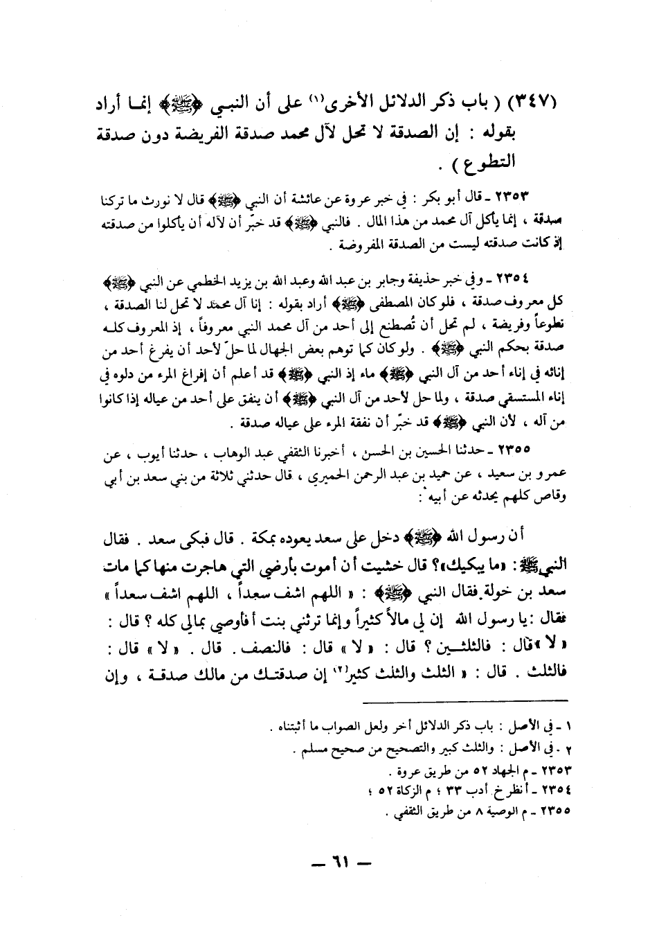 2355 - حَدَّثَنَا الْحُسَيْنُ بْنُ الْحَسَنِ، أَخْبَرَنَا الثَّقَفِيُّ عَبْدُ الْوَهَّابِ، حَدَّثَنَا أَيُّوبُ، عَنْ عَمْرِو بْنِ سَعِيدٍ، عَنْ حُمَيْدِ بْنِ عَبْدِ الرَّحْمَنِ الْحِمْيَرِيِّ قَالَ حَدَّثَنِي ثَلَاثَةٌ مِنْ بَنِي سَعْدِ بْنِ أَبِي وَقَّاصٍ كُلُّهُمْ يُحَدِّثُهُ، عَنْ أَبِيهِ، أَنَّ رَسُولَ اللَّهِ صَلَّى اللهُ عَلَيْهِ وَسَلَّمَ دَخَلَ عَلَى سَعْدٍ يَعُودُهُ بِمَكَّةَ قَالَ: فَبَكَى سَعْدٌ، فَقَالَ النَّبِيُّ صَلَّى اللهُ عَلَيْهِ وَسَلَّمَ: «مَا يُبْكِيكَ؟» قَالَ: خَشِيتُ أَنْ أَمُوتَ بِأَرْضِي الَّتِي هَاجَرْتُ مِنْهَا كَمَا مَاتَ سَعْدُ بْنُ خَوْلَةَ، فَقَالَ النَّبِيُّ صَلَّى اللهُ عَلَيْهِ وَسَلَّمَ: «اللَّهُمَّ اشْفِ سَعْدًا، اللَّهُمَّ اشْفِ سَعْدًا» فَقَالَ: يَا رَسُولَ اللَّهِ إِنَّ لِي مَالًا كَثِيرًا، وَإِنَّمَا تَرِثُنِي بِنْتٌ أَفَأُوصِي بِمَالِي كُلِّهِ قَالَ: «لَا» قَالَ: فَالثُّلُثَيْنِ: قَالَ: «لَا» قَالَ: فَالنِّصْفُ: قَالَ: «لَا» قَالَ: فَالثُّلُثُ قَالَ: «الثُّلُثُ، وَالثُّلُثُ كَثِيرٌ إِنَّ §صَدَقَتَكَ مِنْ مَالِكَ صَدَقَةٌ، وَإِنَّ نَفَقَتَكَ عَلَى عِيَالِكَ لَكَ صَدَقَةٌ، وَإِنَّ مَا تَأْكُلُ امْرَأَتُكَ مِنْ طَعَامِكَ لَكَ صَدَقَةٌ، وَإِنَّكَ إِنْ تَدَعْ أَهْلَكَ بِخَيْرٍ - أَوْ قَالَ بِعَيْشٍ - خَيْرٌ لَكَ مِنْ أَنْ تَدَعَهُمْ عَالَةً يَتَكَفَّفُونَ» وَقَالَ بِيَدِهِ