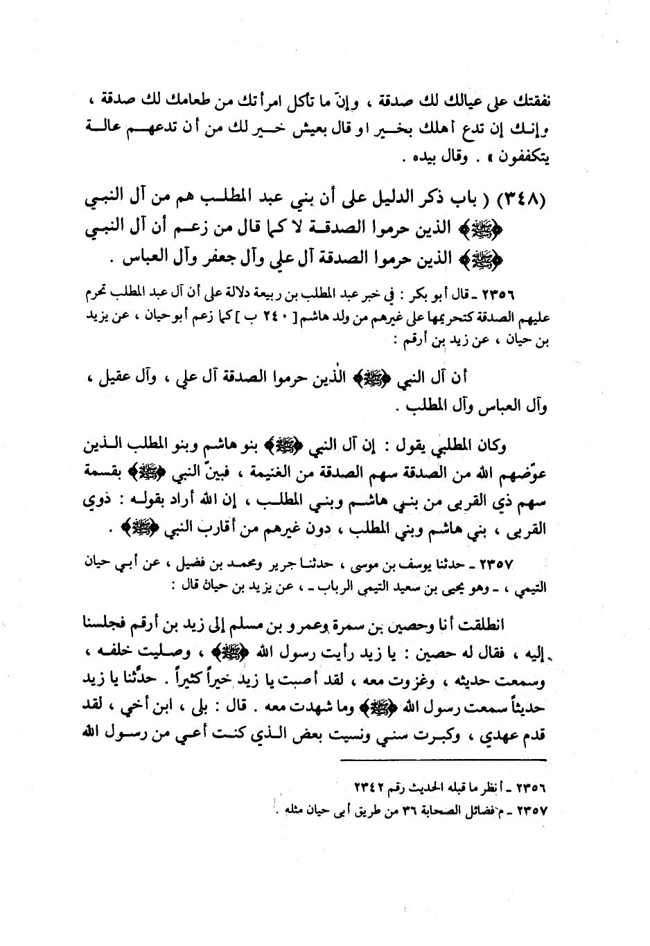 2356 - قَالَ أَبُو بَكْرٍ: فِي خَبَرِ عَبْدِ الْمُطَّلِبِ بْنِ رَبِيعَةَ دَلَالَةٌ عَلَى أَنَّ آلَ عَبْدِ الْمُطَّلِبِ تَحْرُمُ عَلَيْهِمُ الصَّدَقَةُ كَتَحْرِيمِهَا عَلَى غَيْرِهِمْ مِنْ وَلَدِ هَاشِمٍ، كَمَا زَعَمَ أَبُو حَيَّانَ، عَنْ يَزِيدَ بْنِ حَيَّانَ، عَنْ زَيْدِ بْنِ أَرْقَمَ، «أَنَّ §آلَ النَّبِيِّ صَلَّى اللهُ عَلَيْهِ وَسَلَّمَ الَّذِينَ حُرِمُوا الصَّدَقَةَ، آلُ عَلِيٍّ، وَآلُ عُقَيْلٍ، وَآلُ الْعَبَّاسِ، وَآلُ الْمُطَّلِبِ» . وَكَانَ الْمُطَّلِبِيُّ يَقُولُ: «إِنَّ آلَ النَّبِيِّ صَلَّى اللهُ عَلَيْهِ وَسَلَّمَ بَنُو هَاشِمٍ، وَبَنُو الْمُطَّلِبِ الَّذِينَ عَوَّضَهُمُ اللَّهُ مِنَ الصَّدَقَةِ سَهْمَ الصَّدَقَةِ مِنَ الْغَنِيمَةِ فَبَيَّنَ النَّبِيُّ صَلَّى اللهُ عَلَيْهِ وَسَلَّمَ بِقَسْمِهِ سَهْمَ ذِي الْقُرْبَى مِنْ بَنِي هَاشِمٍ، وَبَنِي الْمُطَّلِبِ إنَّ اللَّهَ أَرَادَ بِقَوْلِهِ ذَوِي الْقُرْبَى بَنِي هَاشِمٍ، وَبَنِي الْمُطَّلِبِ دُونَ غَيْرِهِمْ مِنْ أَقَارِبِ النَّبِيِّ صَلَّى اللهُ عَلَيْهِ وَسَلَّمَ»