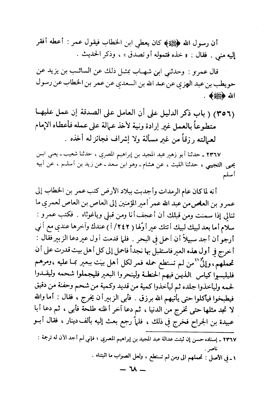 2367 - حَدَّثَنَا أَبُو زُهَيْرٍ عَبْدُ الْمَجِيدِ بْنُ إِبْرَاهِيمَ الْمِصْرِيُّ، حَدَّثَنَا شُعَيْبٌ يَعْنِي ابْنَ يَحْيَى التُّجِيبِيُّ، حَدَّثَنَا اللَّيْثُ، عَنْ هِشَامٍ وَهُوَ ابْنُ سَعْدٍ، عَنْ زَيْدِ بْنِ أَسْلَمَ، عَنْ أَبِيهِ أَسْلَمَ، أَنَّهُ لَمَّا كَانَ عَامُ الرَّمَدَاتِ، وَأَجْدَبَتْ بِبِلَادٍ الْأَرْضُ، كَتَبَ عُمَرُ بْنُ الْخَطَّابِ إِلَى عَمْرِو بْنِ الْعَاصِ: «مِنْ عَبْدِ اللَّهِ عُمَرَ أَمِيرِ الْمُؤْمِنِينَ، إِلَى الْعَاصِ بْنِ الْعَاصِ لَعَمْرِي §مَا تُبَالِي إِذَا سَمِنْتَ، وَمَنْ قِبَلَكَ أَنْ أَعْجَفَ أَنَا وَمَنْ قِبَلِي، وَيَا غَوْثَاهُ» . فَكَتَبَ عَمْرٌو: " سَلَامٌ، أَمَّا بَعْدُ لَبَّيْكَ لَبَّيْكَ أَتَتْكَ عِيرٌ أَوَّلُهَا عِنْدَكَ، وَآخِرُهَا عِنْدِي، مَعَ أَنِّي أَرْجُو أَنْ أَجِدَ سَبِيلًا أَنْ أَحْمِلَ فِي الْبَحْرِ، فَلَمَّا قَدِمَتْ أَوَّلُ عِيرٍ دَعَا الزُّبَيْرَ، فَقَالَ: اخْرُجْ فِي أَوَّلِ هَذِهِ الْعِيرِ، فَاسْتَقْبِلْ بِهَا نَجْدًا، فَاحْمِلْ إِلَى كُلِّ أَهْلِ بَيْتٍ قَدَرْتَ عَلَى أَنْ تُحَمِّلَهُمُ، وَإِلَى مَنْ لَمْ تَسْتَطِعْ حَمْلَهُ فَمُرْ لِكُلِّ أَهْلِ بَيْتٍ بِبَعِيرٍ بِمَا عَلَيْهِ، وَمُرْهُمْ فَلْيَلْبَسُوا كِيَاسَ الَّذِينَ فِيهِمُ الْحِنْطَةُ، وَلْيَنْحَرُوا الْبَعِيرَ، فَلْيَجْمُلُوا شَحْمَهُ، وَلْيَقْدُوا لَحْمَهُ، وَلْيَأْخُذُوا جِلْدَهُ، ثُمَّ لِيَأْخُذُوا كَمِّيَّةً مِنْ قَدِيدٍ، وَكَمِّيَّةً مِنْ شَحْمٍ، وَحِفْنَةً مِنْ دَقِيقٍ، فَيَطْبُخُوا، فَيَأْكُلُوا حَتَّى يَأْتِيَهُمُ اللَّهُ بِرِزْقٍ، فَأَبَى الزُّبَيْرُ أَنْ يَخْرُجَ، فَقَالَ: أَمَا وَاللَّهِ لَا تَجِدُ مِثْلَهَا حَتَّى تَخْرُجَ مِنَ الدُّنْيَا، ثُمَّ دَعَا آخَرَ أَظُنُّهُ طَلْحَةَ، فَأَبَى، ثُمَّ دَعَا أَبَا عُبَيْدَةَ بْنَ الْجَرَّاحِ، فَخَرَجَ فِي ذَلِكَ فَلَمَّا رَجَعَ بَعَثَ إِلَيْهِ بِأَلْفِ دِينَارٍ، فَقَالَ أَبُو عُبَيْدَةَ: إِنِّي لَمْ أَعْمَلْ لَكَ يَا ابْنَ الْخَطَّابِ، إِنَّمَا عَمِلْتُ لِلَّهِ، وَلَسْتُ آخُذُ فِي ذَلِكَ شَيْئًا، فَقَالَ عُمَرُ: قَدْ أَعْطَانَا رَسُولُ اللَّهِ صَلَّى اللهُ عَلَيْهِ وَسَلَّمَ فِي أَشْيَاءَ بَعَثَنَا لَهَا فَكَرِهْنَا، فَأَبَى ذَلِكَ عَلَيْنَا رَسُولُ اللَّهِ صَلَّى اللهُ عَلَيْهِ وَسَلَّمَ، فَاقْبَلْهَا أَيُّهَا الرَّجُلُ فَاسْتَعِنْ بِهَا عَلَى دُنْيَاكَ وَدِينِكَ فَقَبِلَهَا أَبُو عُبَيْدَةَ بْنُ الْجَرَّاحِ ثُمَّ ذَكَرَ الْحَدِيثَ. قَالَ أَبُو بَكْرٍ: «فِي الْقَلْبِ مِنْ عَطِيَّةَ بْنِ سَعْدٍ الْعَوْفِيِّ إِلَّا أَنَّ هَذَا الْخَبَرَ قَدْ رَوَاهُ زَيْدُ بْنُ أَسْلَمَ، عَنْ عَطَاءِ بْنِ يَسَارٍ، عَنْ أَبِي سَعِيدٍ قَدْ خَرَّجْتُهُ فِي مَوْضِعٍ آخَرَ» K2367 - قال الألباني: إسناده حسن إن ثبتت عدالة عبد المجيد فإني إلى الآن لم أجد له ترجمة