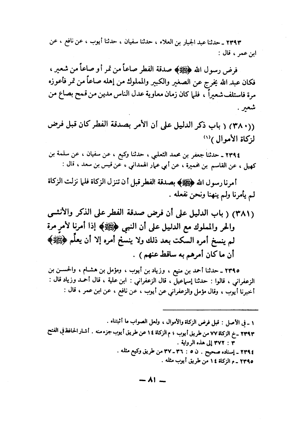 2395 - حَدَّثَنَا أَحْمَدُ بْنُ مَنِيعٍ، وَزِيَادُ بْنُ أَيُّوبَ، وَمُؤَمَّلُ بْنُ هِشَامٍ، وَالْحَسَنُ بْنُ الزَّعْفَرَانِيُّ قَالُوا: حَدَّثَنَا إِسْمَاعِيلُ، قَالَ الزَّعْفَرَانِيُّ ابْنُ عُلَيَّةَ قَالَ أَحْمَدُ وَزِيَادٌ قَالَ: أَخْبَرَنَا أَيُّوبُ، وَقَالَ مُؤَمَّلٌ وَالزَّعْفَرَانِيُّ عَنْ أَيُّوبَ، عَنْ نَافِعٍ، عَنِ ابْنِ عُمَرَ قَالَ §فَرَضَ رَسُولُ اللَّهِ صَلَّى اللهُ عَلَيْهِ وَسَلَّمَ صَدَقَةَ رَمَضَانَ عَلَى الذَّكَرِ وَالْأُنْثَى وَالْحُرِّ وَالْمَمْلُوكِ، صَاعَ تَمْرٍ أَوْ صَاعَ شَعِيرٍ قَالَ: فَعَدَلَ النَّاسُ نِصْفَ صَاعِ بُرٍّ لَمْ يَقُلْ أَحْمَدُ وَمُؤَمَّلٌ بَعْدُ، زَادَ زِيَادُ بْنُ أَيُّوبَ قَالَ: فَقَالَ نَافِعٌ: كَانَ ابْنُ عُمَرَ يُعْطِي التَّمْرَ إِلَّا عَامًا وَاحِدًا أَعْوَزَ مِنَ التَّمْرِ فَأَعْطَى الشَّعِيرَ