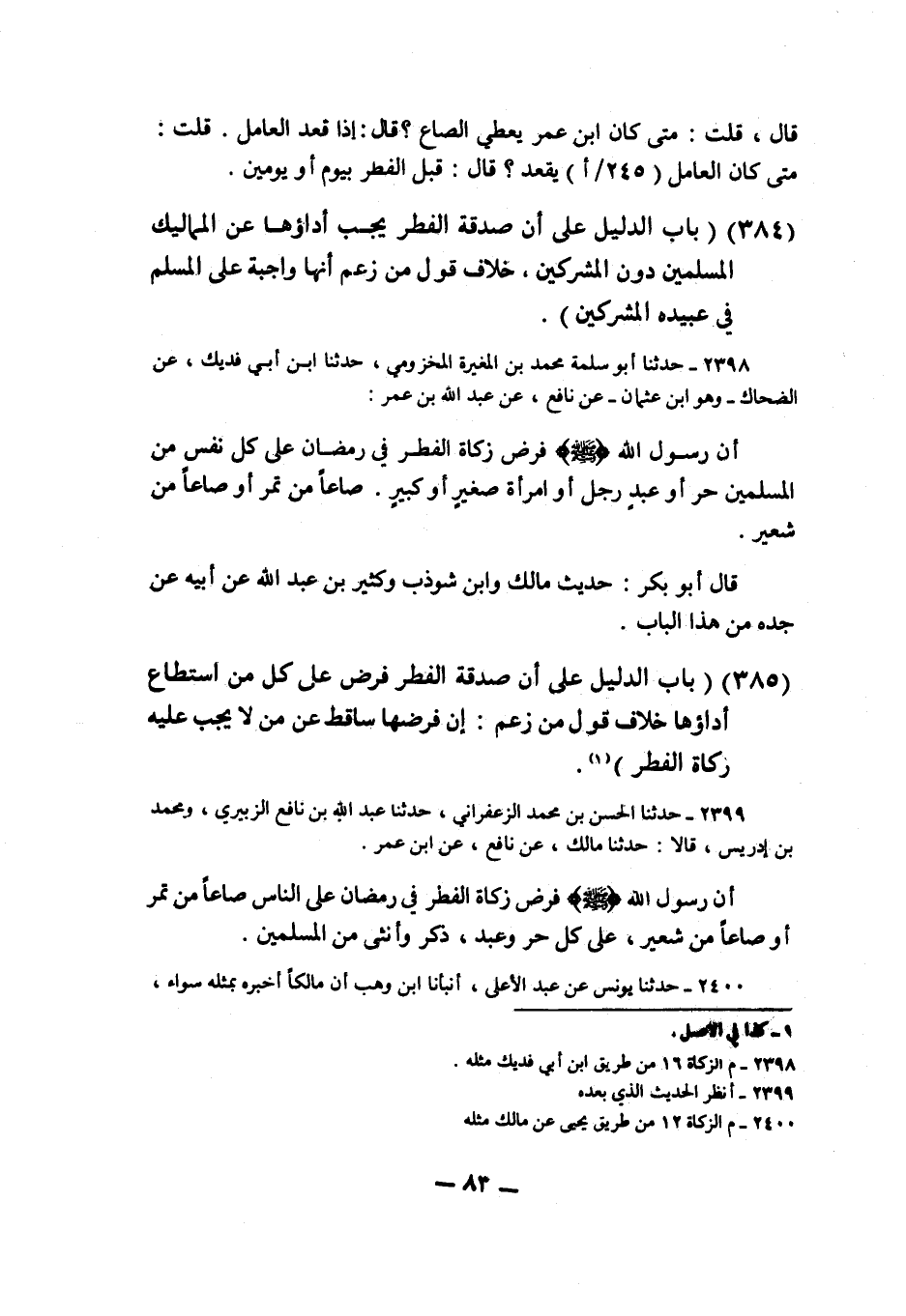 2399 - حَدَّثَنَا الْحَسَنُ بْنُ مُحَمَّدٍ الزَّعْفَرَانِيُّ، حَدَّثَنَا عَبْدُ اللَّهِ بْنُ نَافِعٍ الزُّبَيْرِيُّ، وَمُحَمَّدُ بْنُ إِدْرِيسَ قَالَا حَدَّثَنَا مَالِكٌ، عَنْ نَافِعٍ، عَنِ ابْنِ عُمَرَ، أَنَّ رَسُولَ اللَّهِ صَلَّى اللهُ عَلَيْهِ وَسَلَّمَ §فَرَضَ زَكَاةَ الْفِطْرِ فِي رَمَضَانَ عَلَى النَّاسِ صَاعًا مِنْ تَمْرٍ أَوْ صَاعًا مِنْ شَعِيرٍ عَلَى كُلِّ حُرٍّ وَعَبْدٍ ذَكَرٍ وَأُنْثَى مِنَ الْمُسْلِمِينَ "
