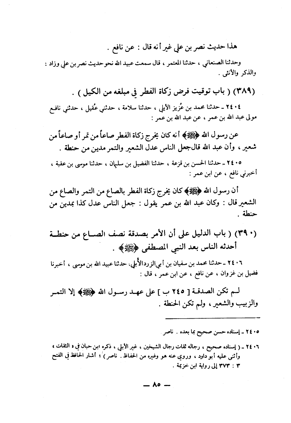 2405 - حَدَّثَنَا الْحَسَنُ بْنُ قَزْعَةَ، حَدَّثَنَا الْفُضَيْلُ بْنُ سُلَيْمَانَ، حَدَّثَنَا مُوسَى بْنُ عُقْبَةَ، أَخْبَرَنِي نَافِعٌ، عَنِ ابْنِ عُمَرَ، أَنَّ رَسُولَ اللَّهِ صَلَّى اللهُ عَلَيْهِ وَسَلَّمَ §كَانَ يُخْرِجُ زَكَاةَ الْفِطْرِ بِالصَّاعِ مِنَ التَّمْرِ، وَالصَّاعِ مِنَ الشَّعِيرِ قَالَ: وَكَانَ عَبْدُ اللَّهِ بْنُ عُمَرَ يَقُولُ: جَعَلَ النَّاسُ عَدْلَ كَذَا بِمُدَّيْنِ مِنْ حِنْطَةٍK2405 - قال الألباني: إسناده حسن صحيح بما بعده