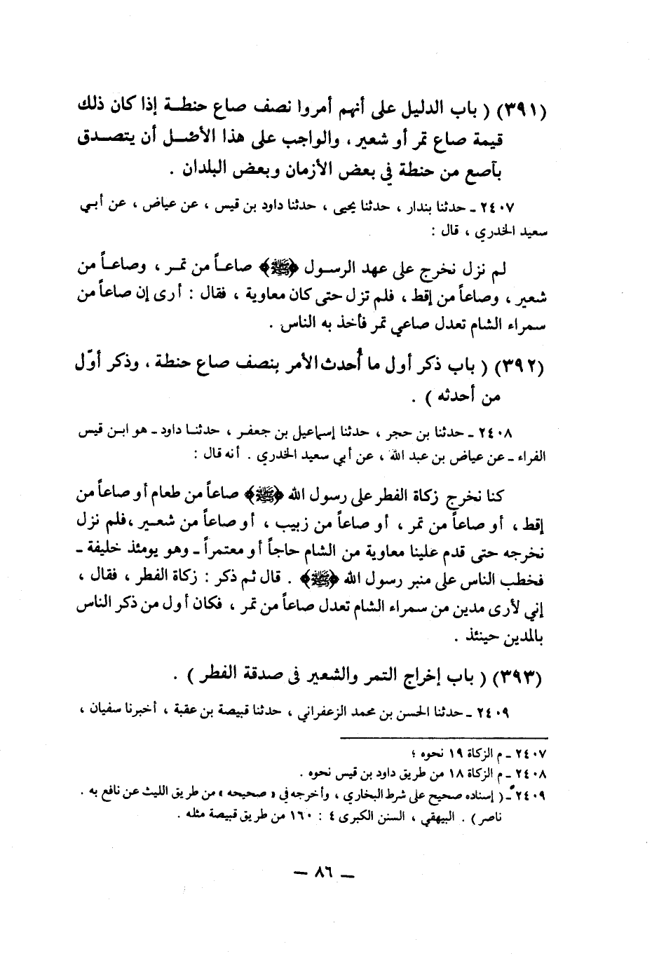 2408 - حَدَّثَنَا ابْنُ حُجْرٍ، حَدَّثَنَا إِسْمَاعِيلُ بْنُ جَعْفَرٍ، حَدَّثَنَا دَاوُدُ هُوَ ابْنُ قَيْسٍ الْفَرَّاءُ، عَنْ عِيَاضِ بْنِ عَبْدِ اللَّهِ، عَنْ أَبِي سَعِيدٍ الْخُدْرِيِّ، أَنَّهُ قَالَ: §كُنَّا نُخْرِجُ زَكَاةَ الْفِطْرِ عَلَى عَهْدِ رَسُولِ اللَّهِ صَلَّى اللهُ عَلَيْهِ وَسَلَّمَ صَاعًا مِنْ طَعَامٍ أَوْ صَاعًا مِنْ أَقِطٍ أَوْ صَاعًا مِنْ تَمْرٍ أَوْ صَاعًا مِنْ زَبِيبٍ أَوْ صَاعًا مِنْ شَعِيرٍ، فَلَمْ نَزَلْ نُخْرِجُهُ، حَتَّى قَدِمَ عَلَيْنَا مُعَاوِيَةُ مِنَ الشَّامِ حَاجًّا أَوْ مُعْتَمِرًا، وَهُوَ يَوْمَئِذٍ خَلِيفَةٌ، فَخَطَبَ النَّاسَ عَلَى مِنْبَرِ رَسُولِ اللَّهِ صَلَّى اللهُ عَلَيْهِ وَسَلَّمَ قَالَ: ثُمَّ ذَكَرَ زَكَاةَ الْفِطْرِ، فَقَالَ: إِنِّي لَأَرَى مُدَّيْنِ مِنْ سَمْرَاءِ الشَّامِ تَعْدِلُ صَاعًا مِنْ تَمْرٍ، فَكَانَ أَوَّلَ مَا ذَكَّرَ النَّاسَ بِالْمُدَّيْنِ حِينَئِذٍ